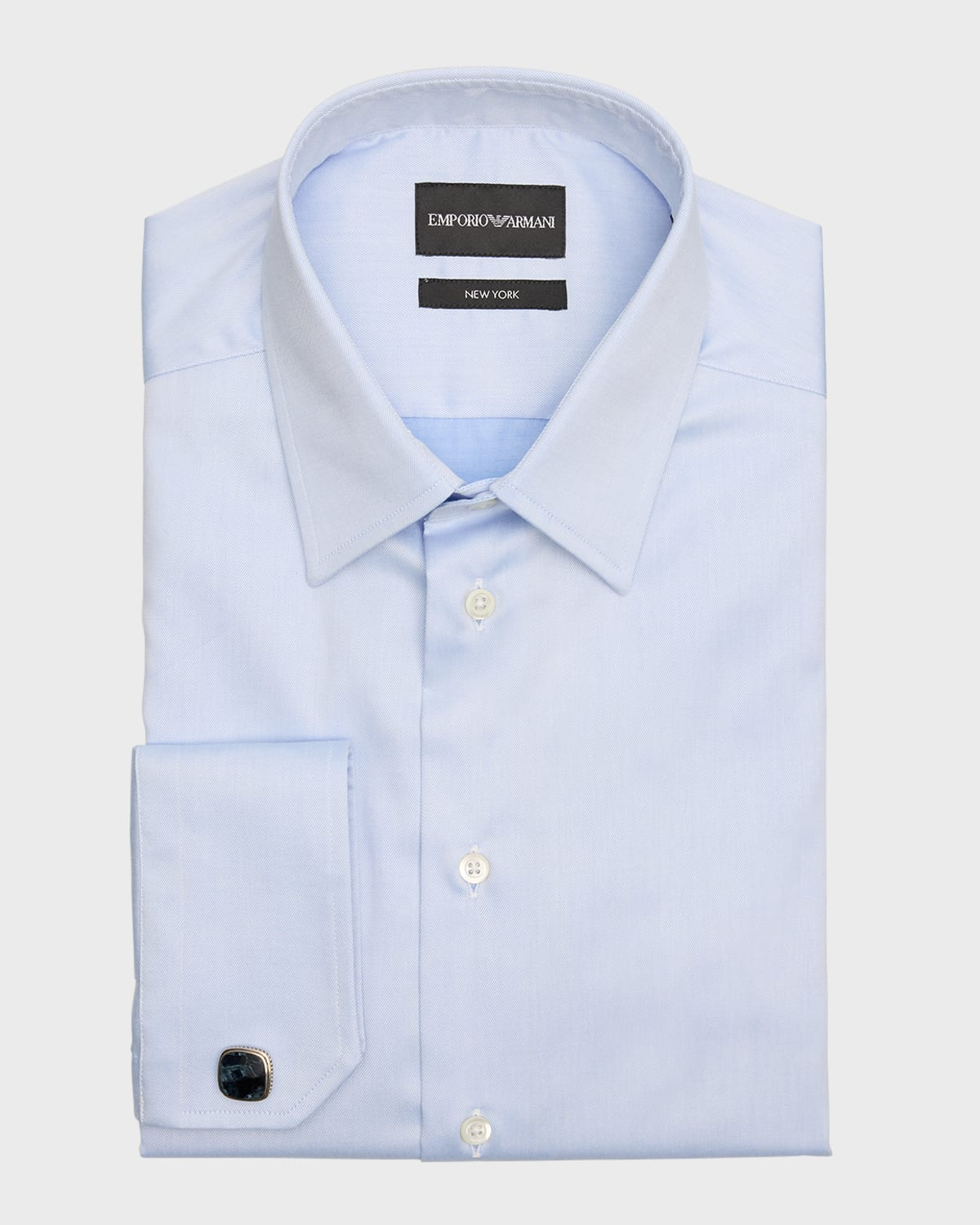 - Emporio Armani dress shirt in solid cotton-stretch fabric - Point collar - Button placket - Long sleeves - French cuffs - Shirttail hem - Cotton/elastane - Dry clean - Imported - Model is 6'1"/185cm.