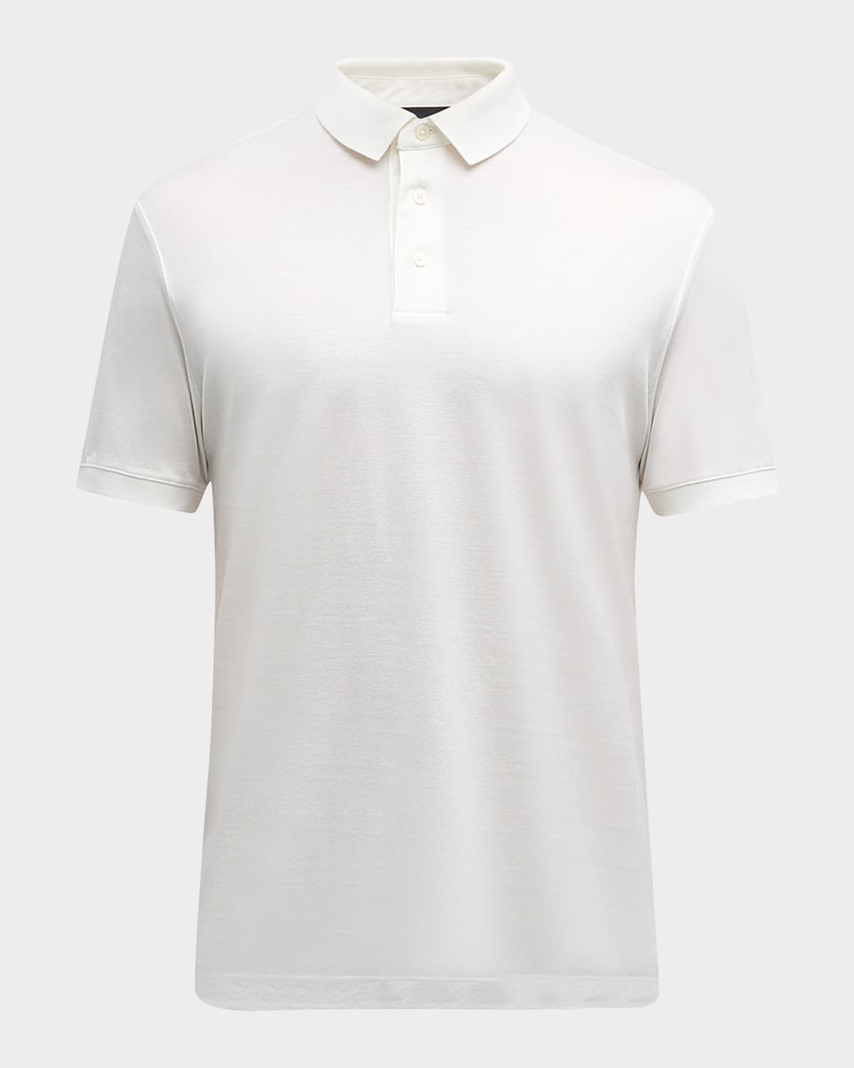 - Emporio Armani solid polo shirt in jersey stretch fabric - Spread collar - Three-button placket - Short sleeves - Ribbed cuffs - Pullover style - Lyocell/cotton - Lining: Cotton/elastane - Dry clean - Imported - Model is 6'1"/185cm.