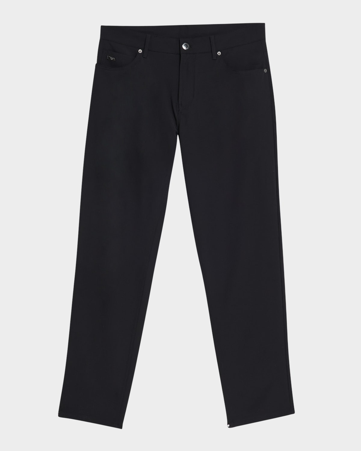 - Emporio Armani pants in solid technical fabric - Regular rise - Flat front - Five-pocket style - Classic fit through straight legs - Full length - Button-zip front; belt loops - Polyester/elastane - Dry clean - Imported