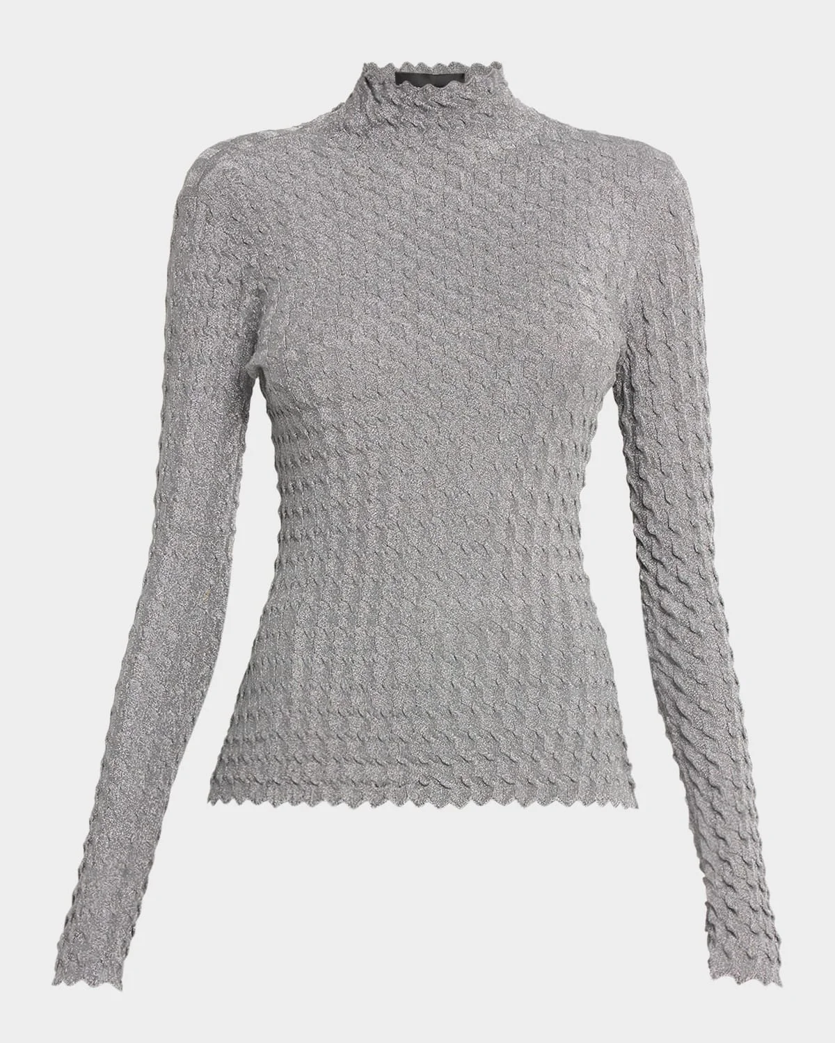 This Emporio Armani sweater is knit in shimmer yarn and features a distinctive, dimensional geometric texture Mock neckline Long sleeves Scalloped cuffs and hem Slim fit Pullover style Viscose/polyester Dry clean Imported