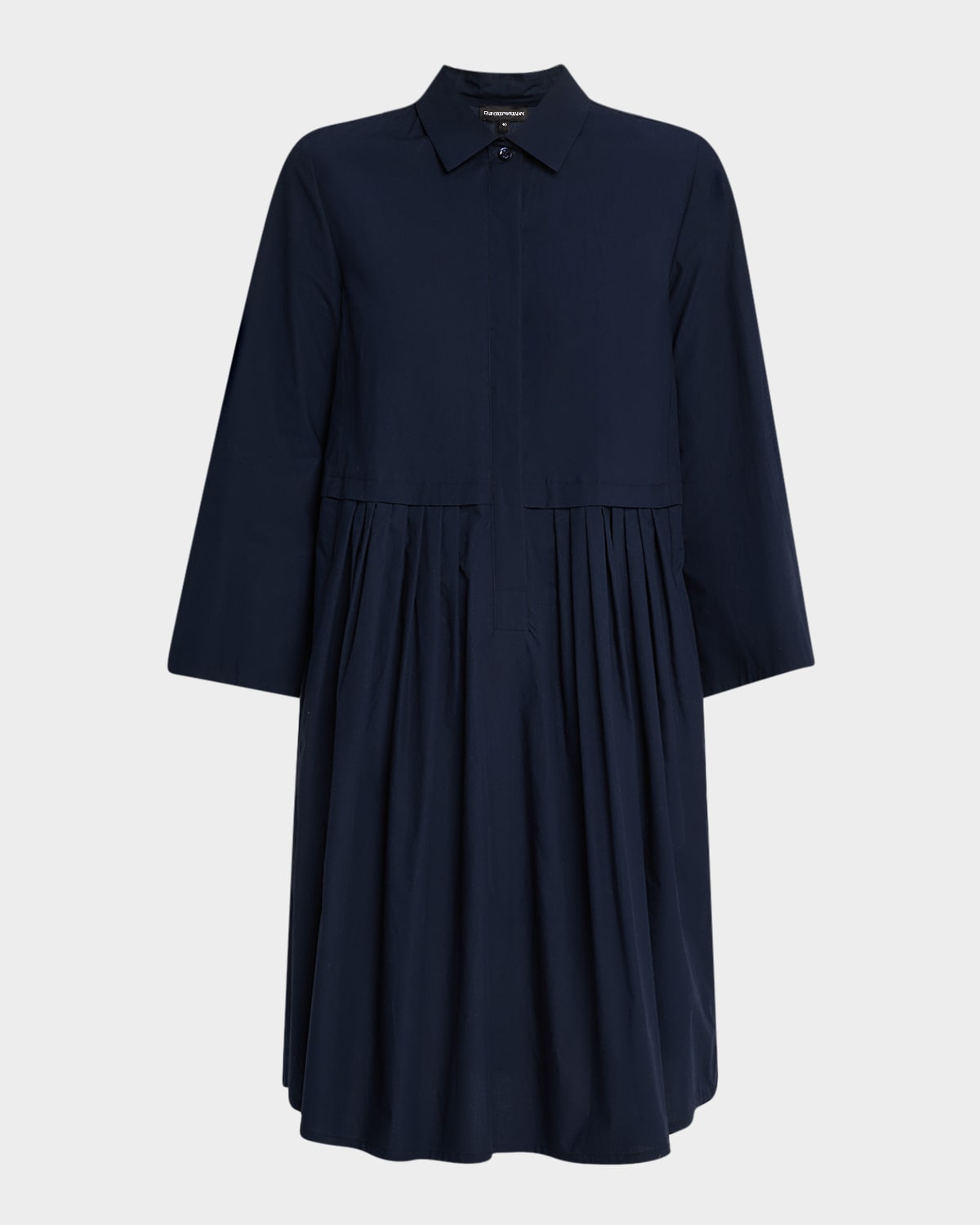 - Emporio Armani pleated shirtdress in cotton poplin - Spread collar; concealed button front - 3/4 sleeves - Hem hits around the knee - A-line silhouette - Step-in style - Cotton - Dry clean - Imported