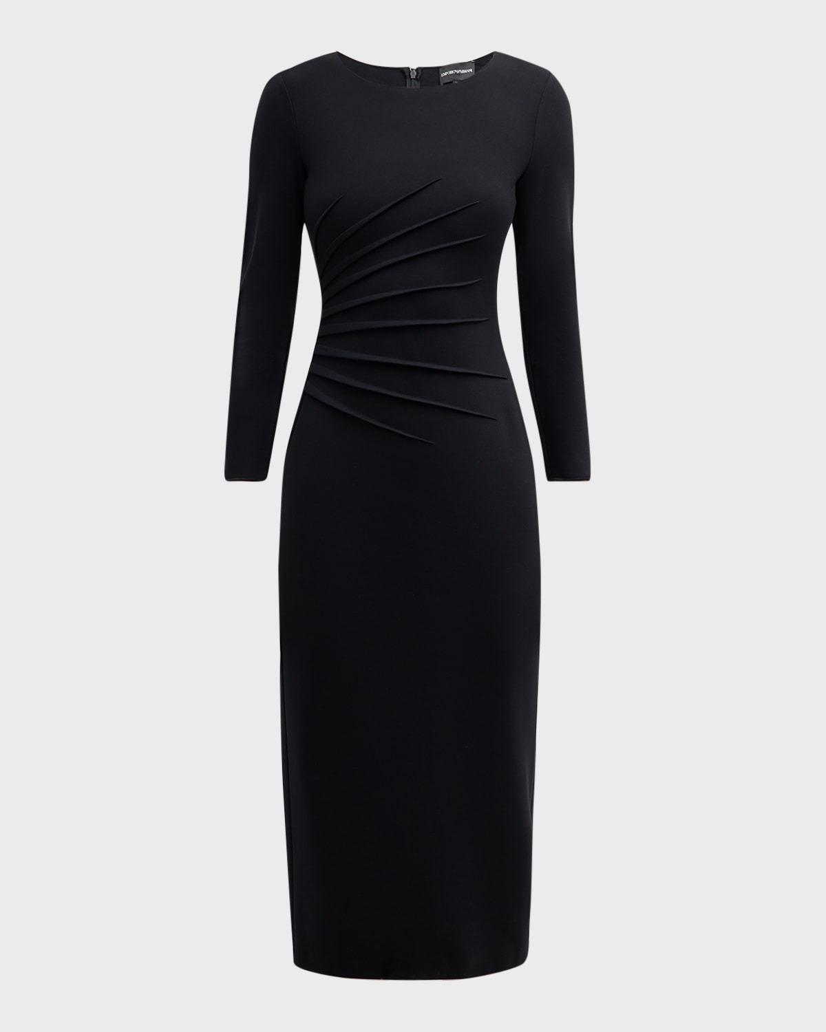 - Emporio Armani pleated midi dress in Milano jersey - Scoop neckline - 3/4 sleeves - Hem falls below the knee - Sheath silhouette - Invisible back zipper - Viscose/nylon/polyamide/elastane - Dry clean - Imported - Size Note: Item runs large, consider ordering a size down. - Model height: 5'10"/177cm.