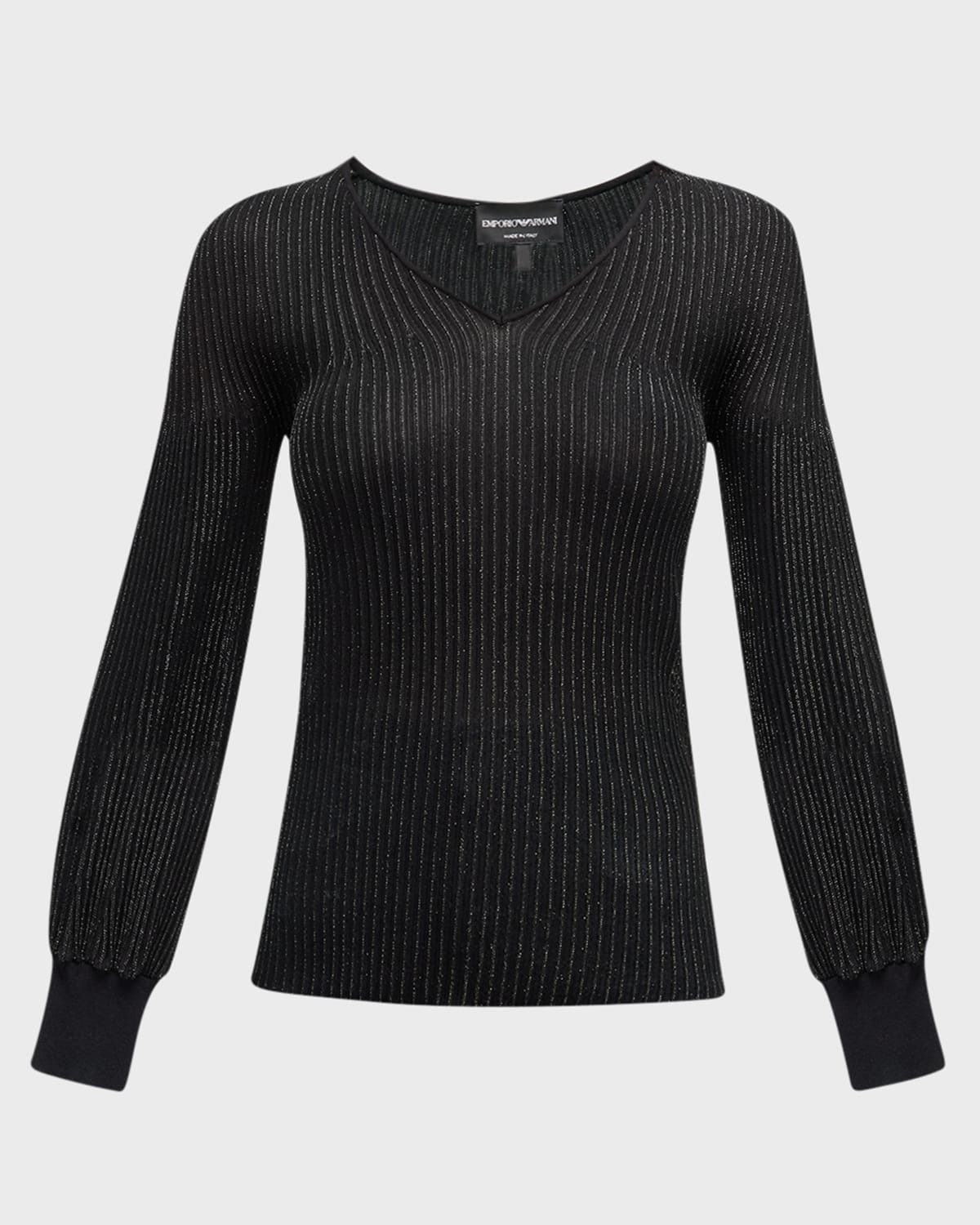 Emporio Armani blouse in a shimmer ribbed knit V neckline Long sleeves Banded cuffs Relaxed fit Pullover style Viscose/polyester/Lurex® Dry clean Made in Italy