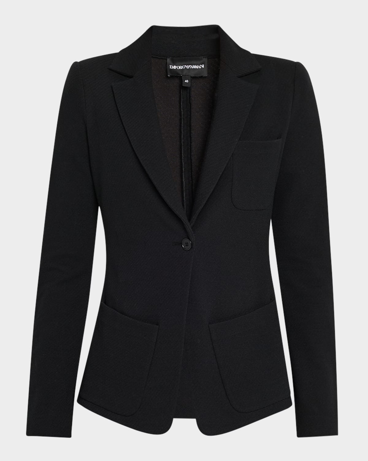 - Emporio Armani jacket in stretch jersey - Notched lapel; single-button front - Long sleeves; three-button cuffs - Chest welt pocket - Front patch pockets - Tailored fit - Polyester/cotton/elastane - Lining: Polyester/elastane - Dry clean - Imported