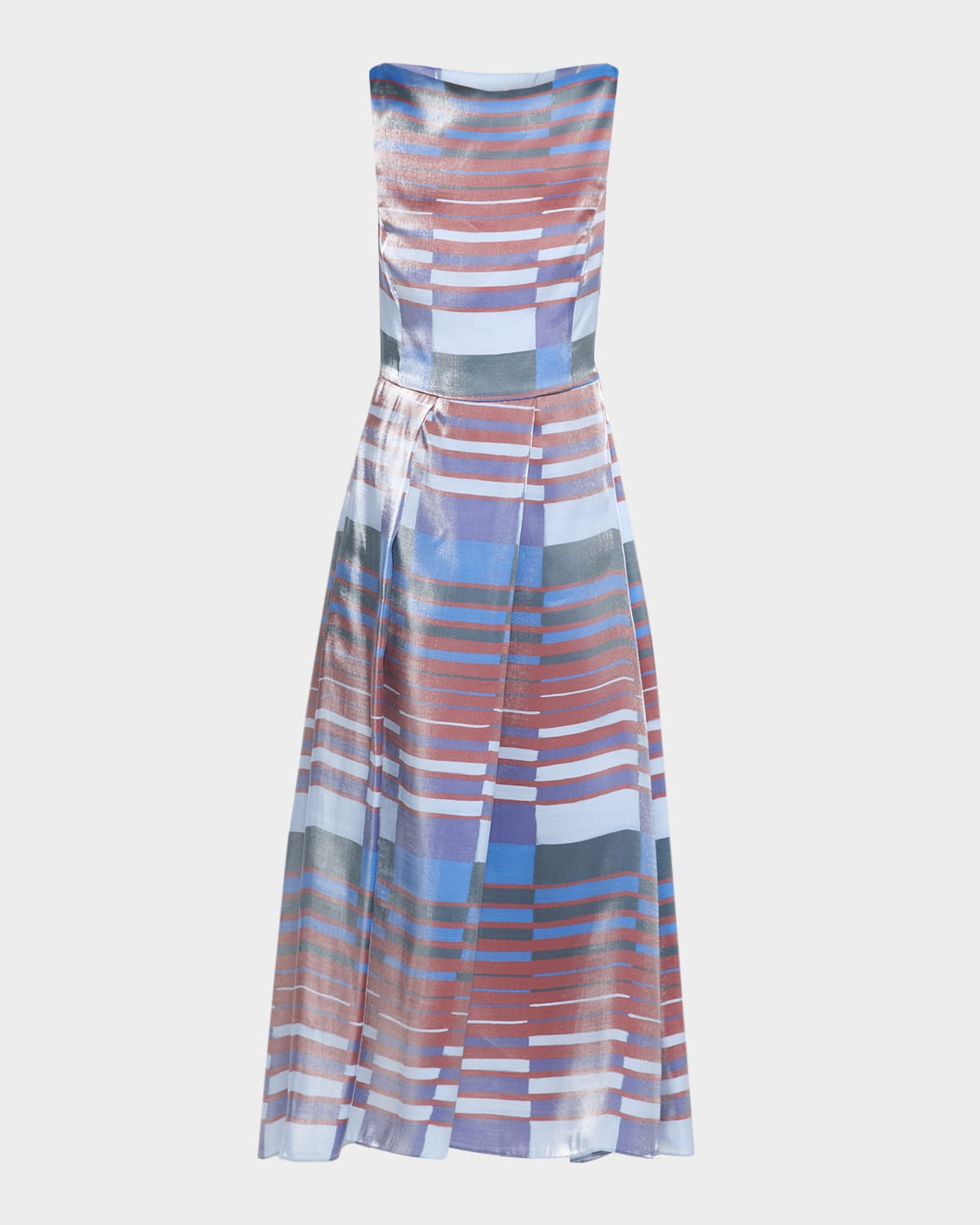 Crafted in shimmering fabric, this pleated midi dress from Emporio Armani features a geometric stripe and checkerboardeffect print High neckline Sleeveless Hem falls below the knee Aline silhouette Invisible side zipper Modal/polyester Dry clean Imported