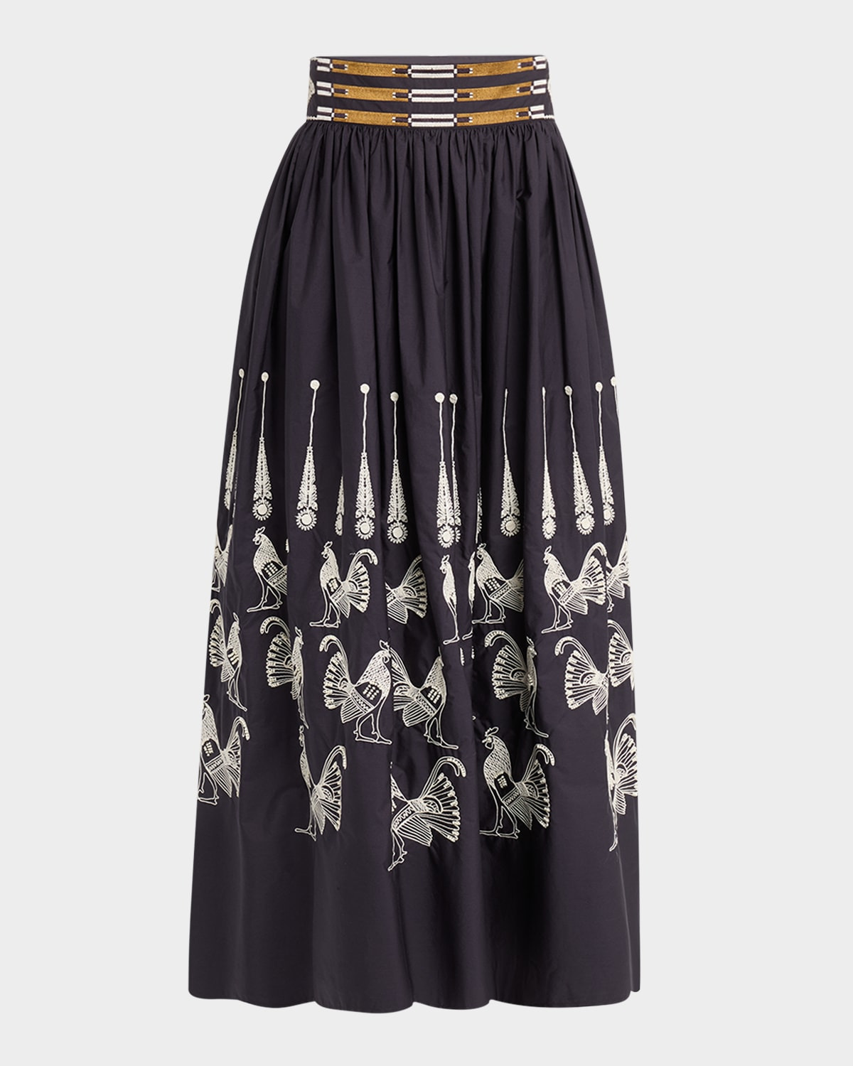 - EMPORIO SIRENUSE "Ombretta" ruched maxi skirt with bead-embellished Greek Rooster embroidery - Sits high on the hips - Embroidered waistband - On-seam pockets - Ankle length - A-line silhouette - Invisible side zipper - Cotton/polyester - Unlined - Dry clean - Trim: Beading - Imported