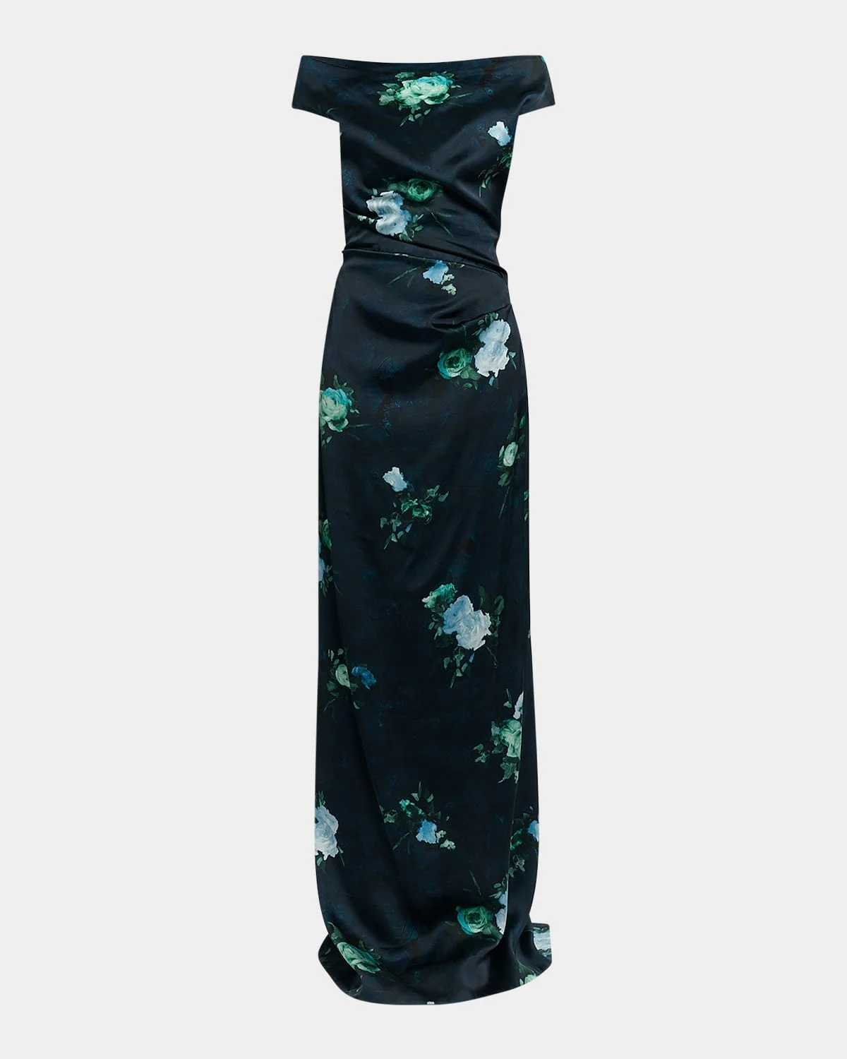 - Erdem draped satin gown featured in an abstract rose placement print - Off-the-shoulder neckline - Short sleeves - Center-cut back vent - Column silhouette - Full length - Invisible back zipper - Viscose - Lining: Silk - Dry clean - Made in Poland