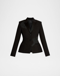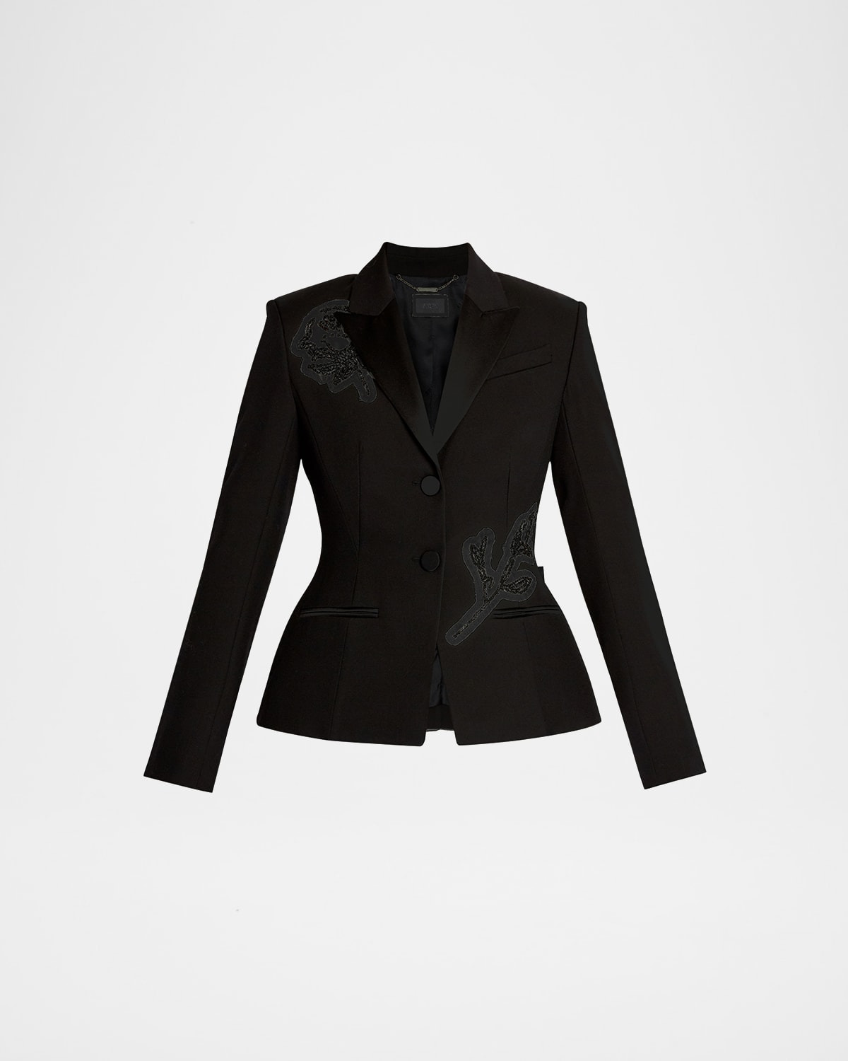 - Erdem hourglass blazer featuring satin lapels and crystal rose embroidery - Peak lapels; single-breasted front - Long sleeves; button cuffs - Chest welt pocket - Hip welt pockets - Fitted - Virgin wool/polyester/silk - Lining: Cupro - Do not iron, dry clean - Made in United Kingdom