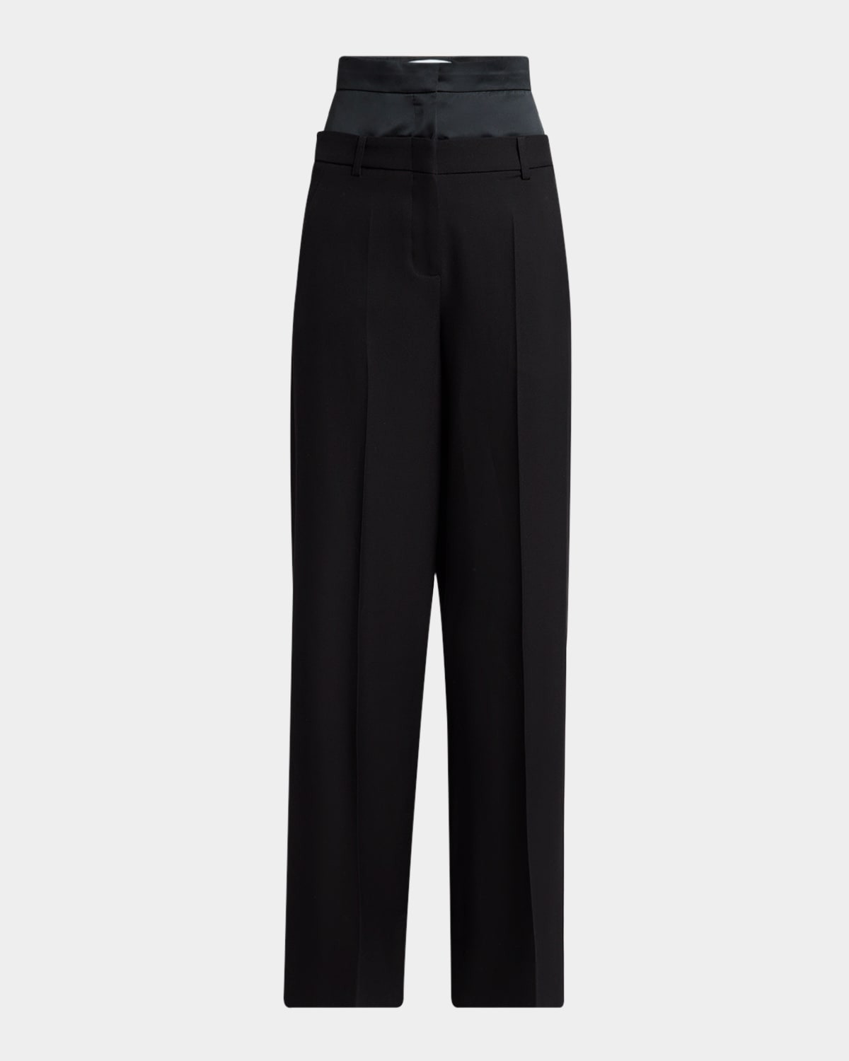 - Erdem crepe trousers featuring a satin double waistband - High rise - Angled side slip pockets - Back welt pockets - Wide legs - Full length - Hook/zip fly; belt loops - Viscose/silk/polyester - Made in Italy