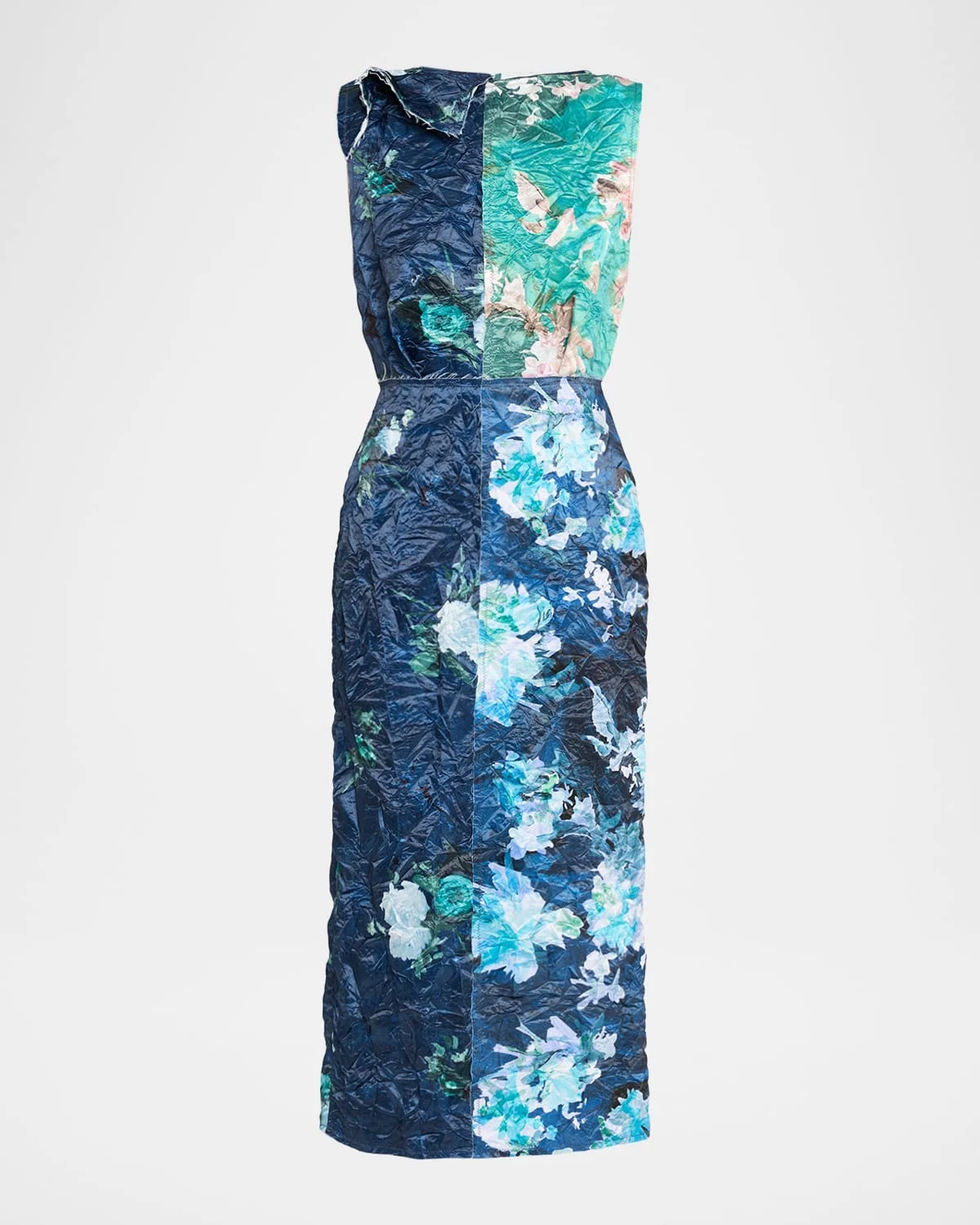 Erdem dress is crafted of floral printed crinkle satin reconstructed in a patchwork design featuring a ruffle neck and raw edges High neckline Sleeveless Sheath silhouette Hem falls below the knee Walking vent back Zip closure Polyester Lining: Silk Dry clean Made in Bulgaria