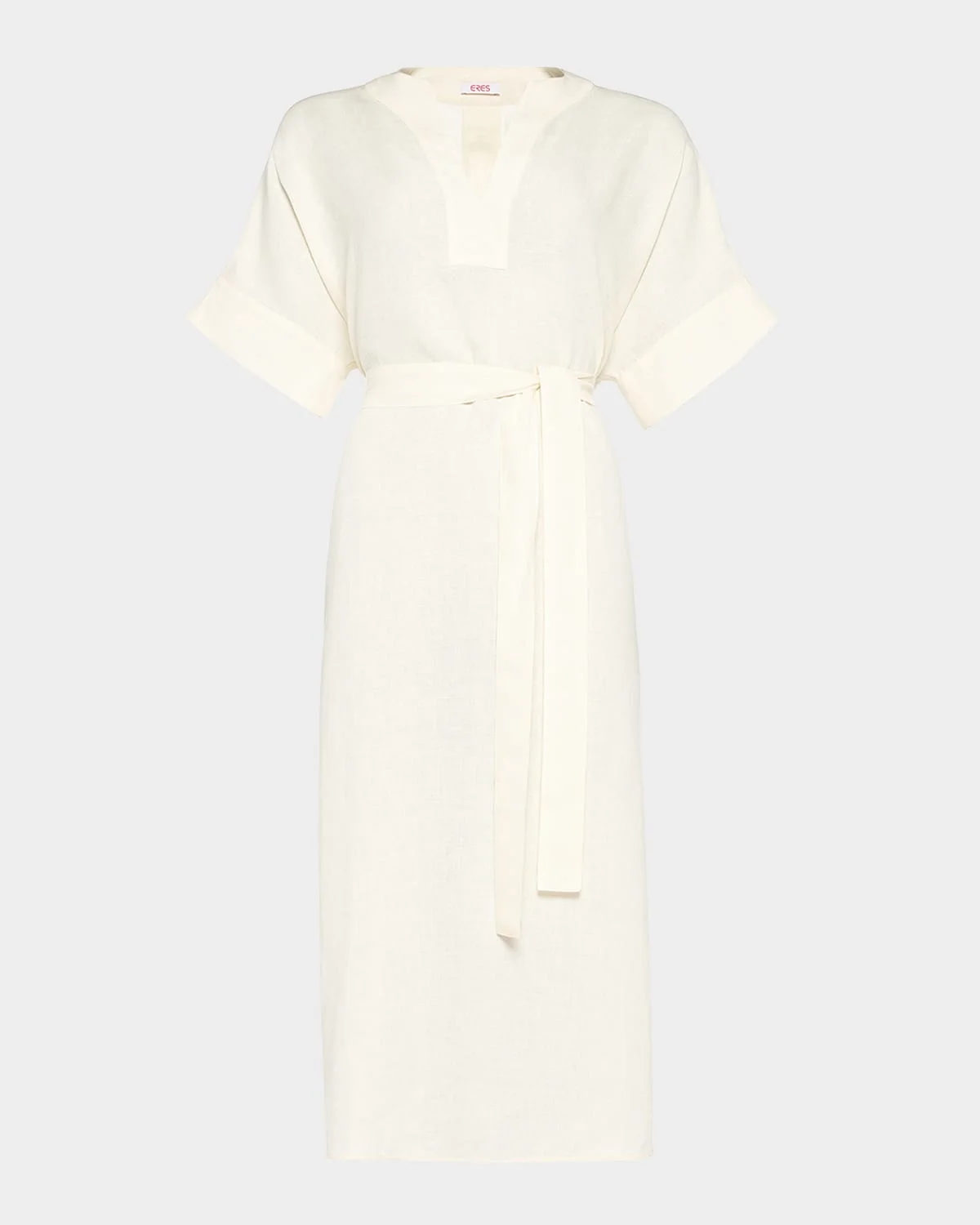 - Eres "Bibi" kaftan coverup crafted from airy linen - Split neckline - Relaxed elbow-length sleeves - Removable self-tie belt - Rounded open side slits - Hem falls below the knee - Slipover style - Linen - Made in Bulgaria