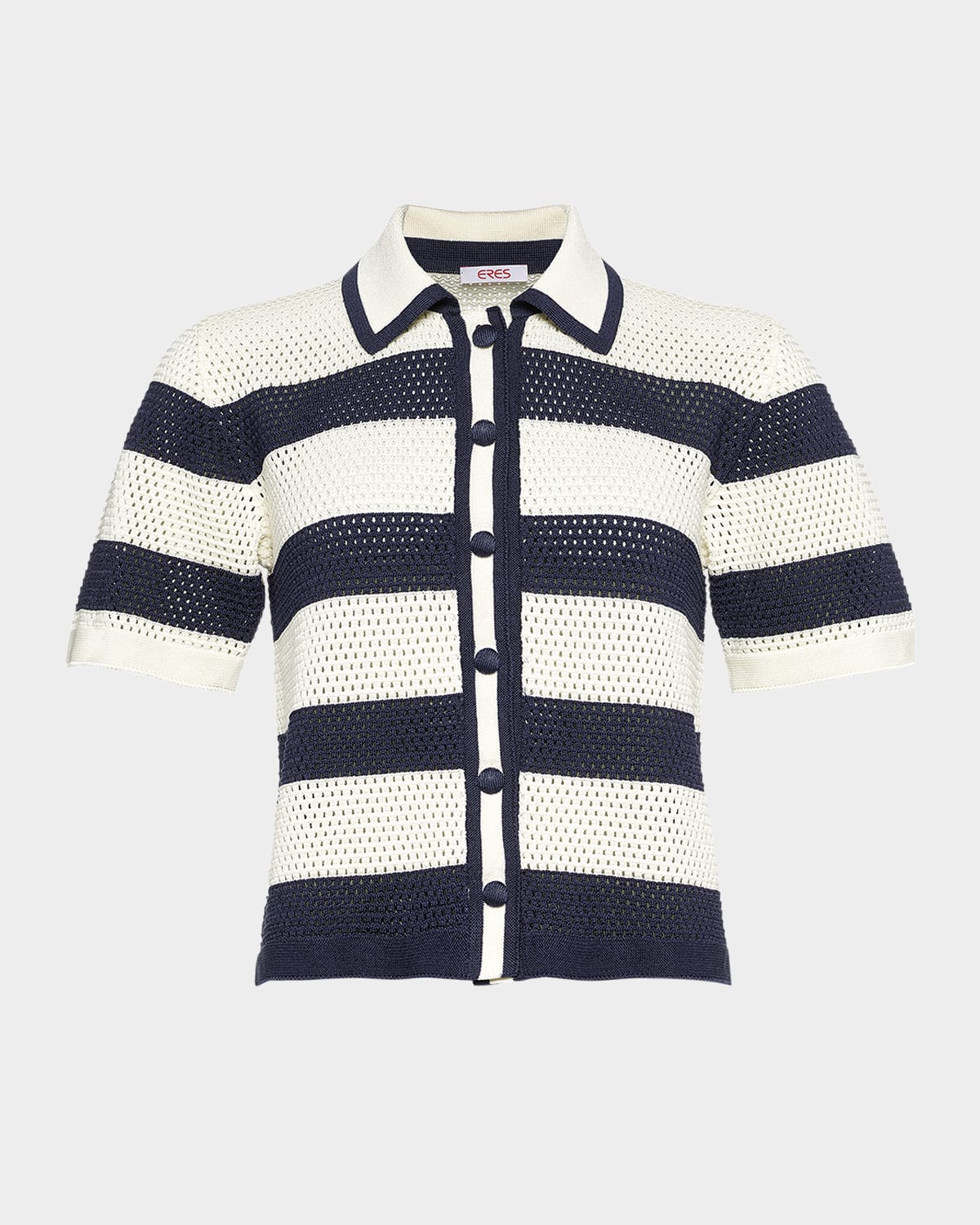 - Eres "Mouette" openwork knit top in a bold-striped design - Polo collar - Short sleeves - Hip length - Relaxed fit - Button front closure - Cotton/viscose - Dry clean - Made in Italy