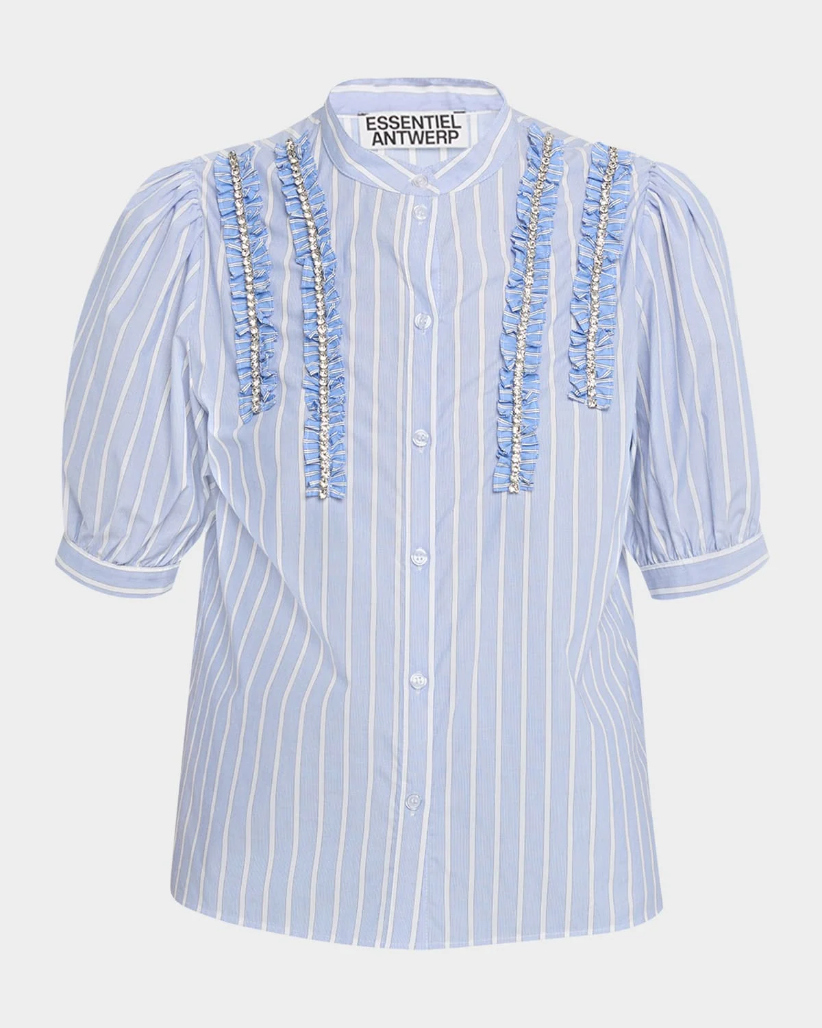 Essentiel Antwerp pinstripe top adorned with frills and rhinestone embellishment High neckline Short puff sleeves with button cuffs Classic fit Hem sits at the hip Buttonfront Cotton/nylon/polyamide/gallerywrapped canvas Hand wash or dry clean Imported