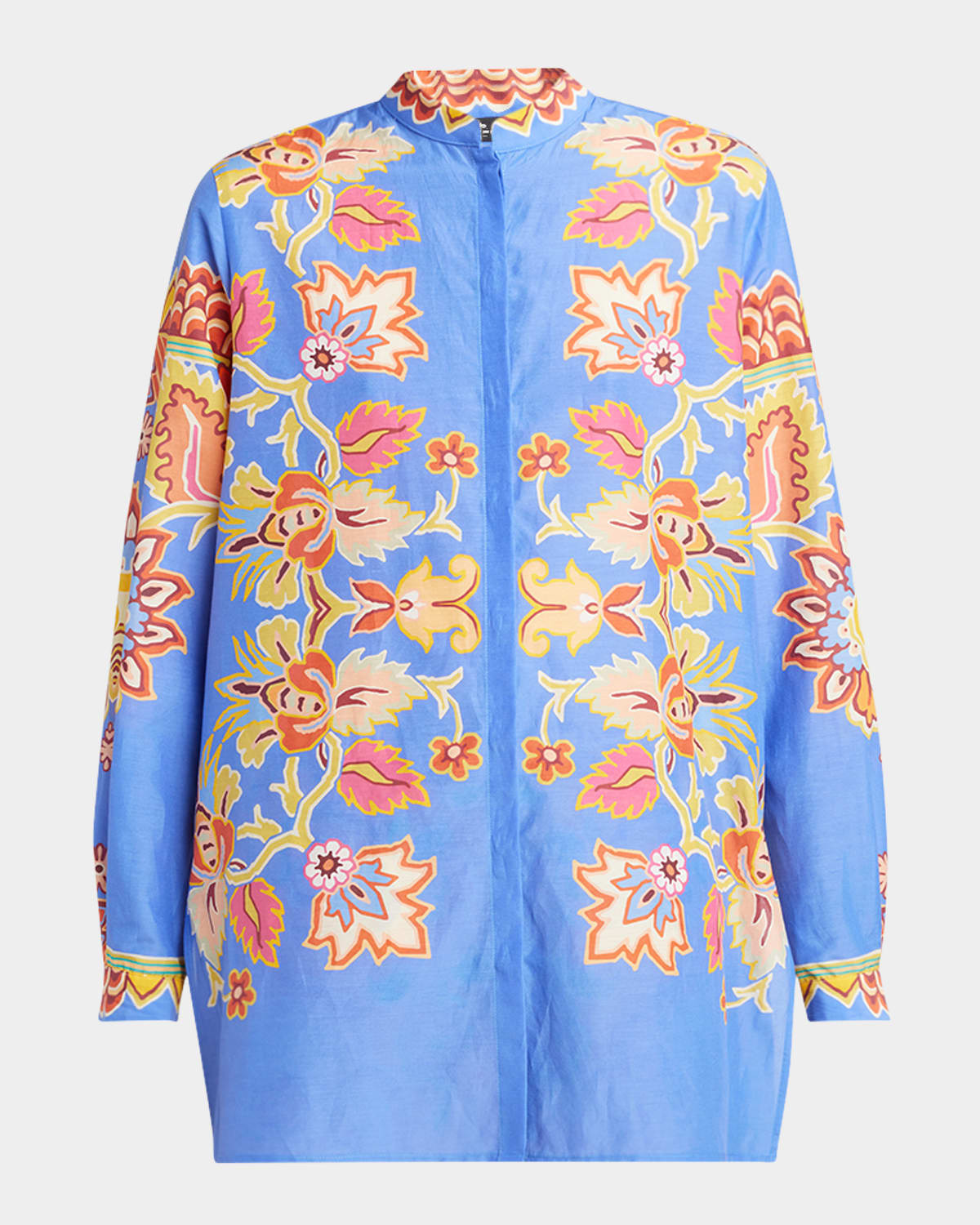 - Etro tunic blouse in blue bouquet voile - Mandarin collar; concealed button front - Long sleeves; button cuffs - Yoked back; box pleat - Loose fit - Shirttail hem; sidfe slits - Cotton/silk - Made in Italy