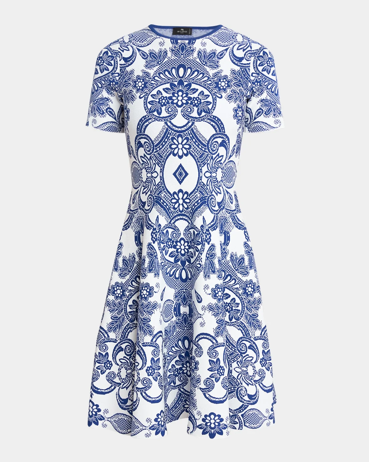- Etro dress in blue medallion lace effect jacquard - Round neckline - Short sleeves - Fit-and-flare silhouette - Knee length - Slipover style - Viscose/polyester - Made in Italy