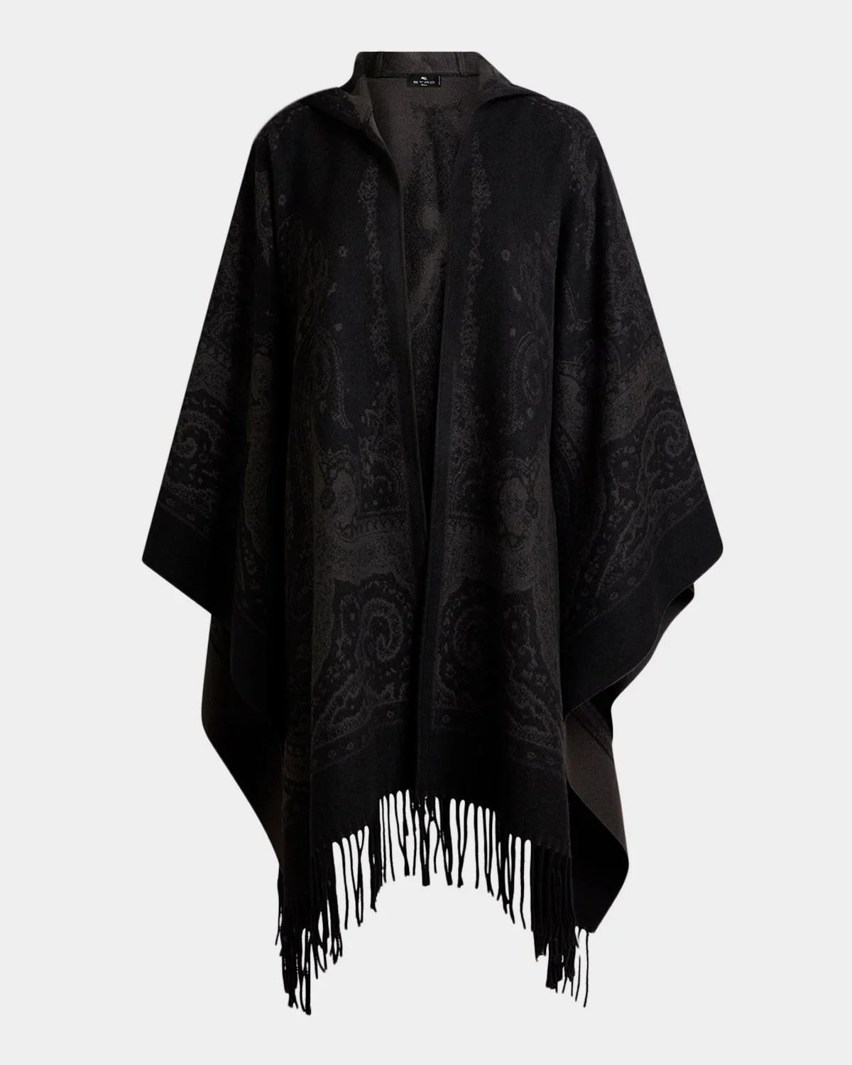 Crafted from tonal paisley & nbsp;jacquard, this Etro hooded cape features & nbsp;an enveloping, open-front silhouette with fringe trim. Hooded Open front Cape sleeves Handkerchief hem Wool Made in Italy
