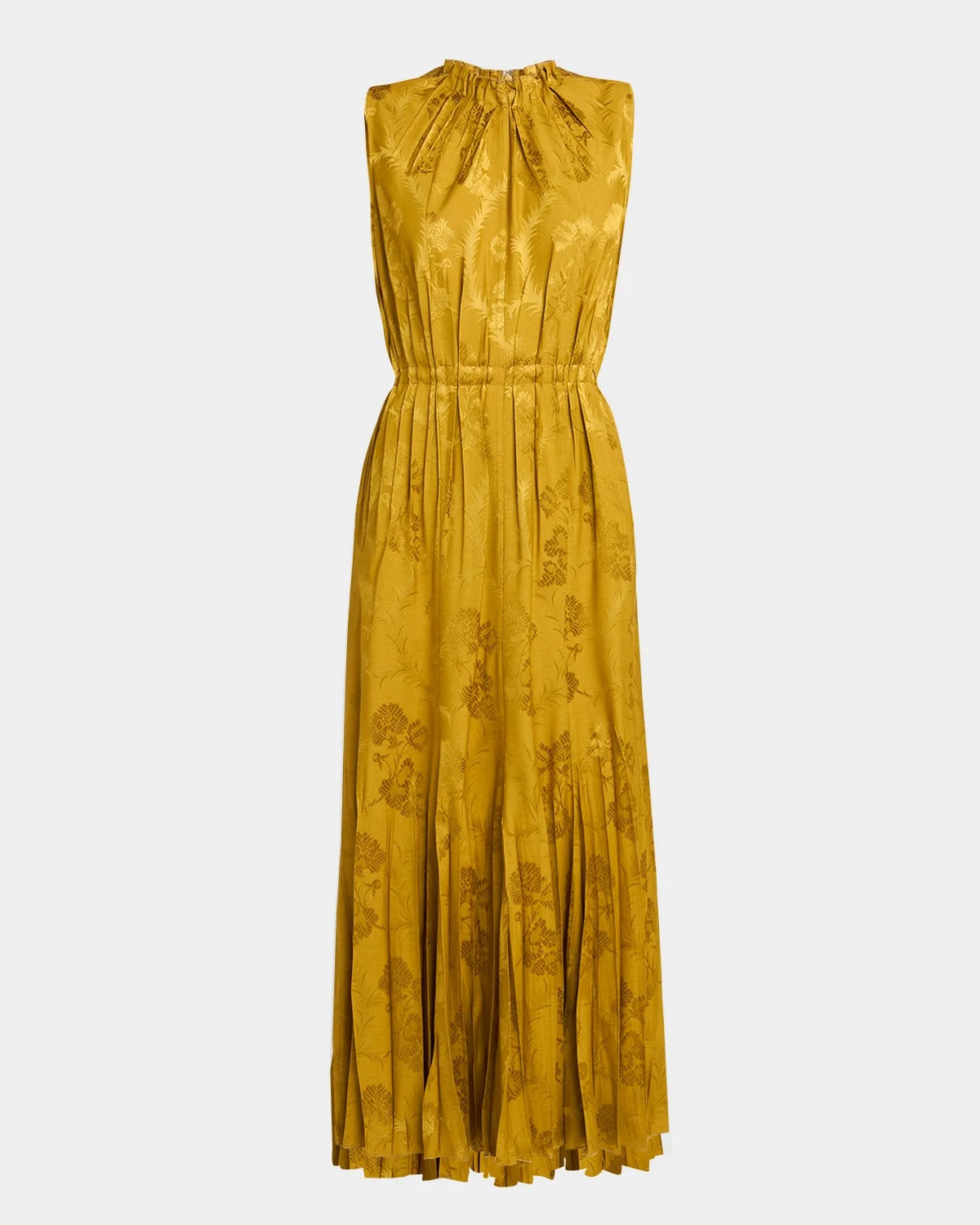 Crafted from a metallic leafy jacquard, this dress by Etro is finished with textural pintucking Gathered mock neckline Sleeveless Elasticized waistband Side seam pockets Hem falls below the knee Aline silhouette Invisible back zipper Polyester/viscose/elastane Made in Italy