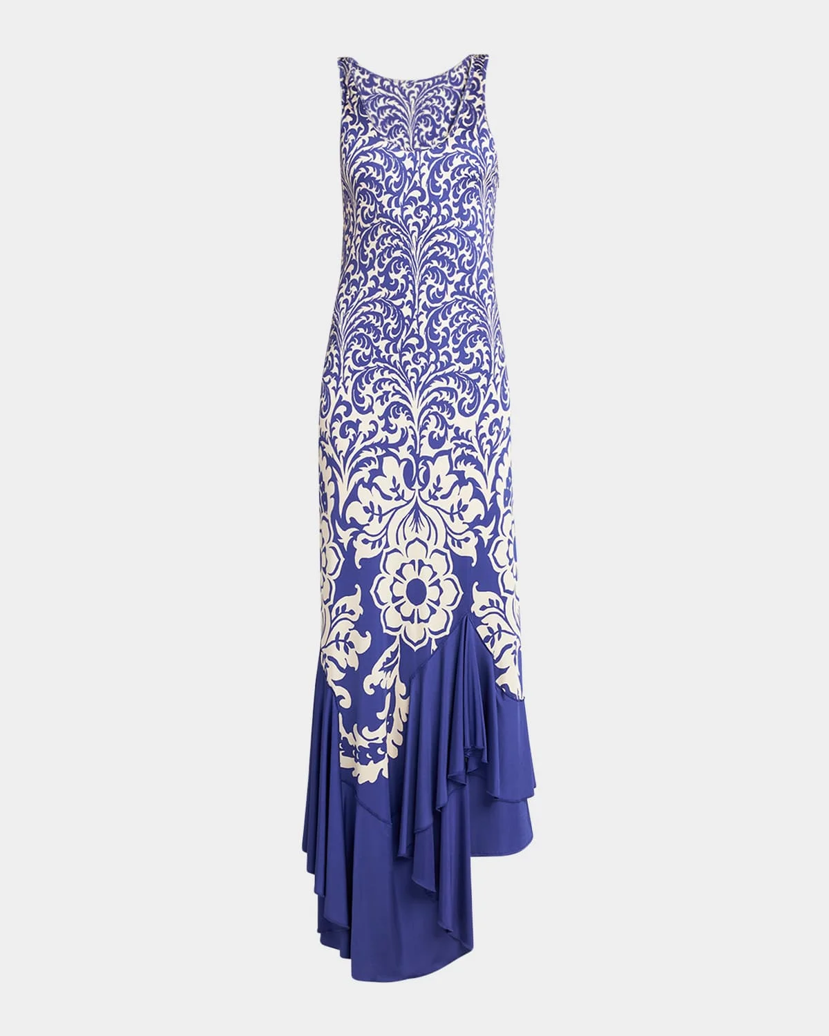 - Etro dress made from lightweight jersey and patterned with vibrant paisley swirls medallions - Scoop neckline; open-back - Sleeveless - Intended to hit the floor - Body-skimming silhouette - Asymmetric voluminous flounce hem - Viscose/elastane - Dry clean - Made in Italy
