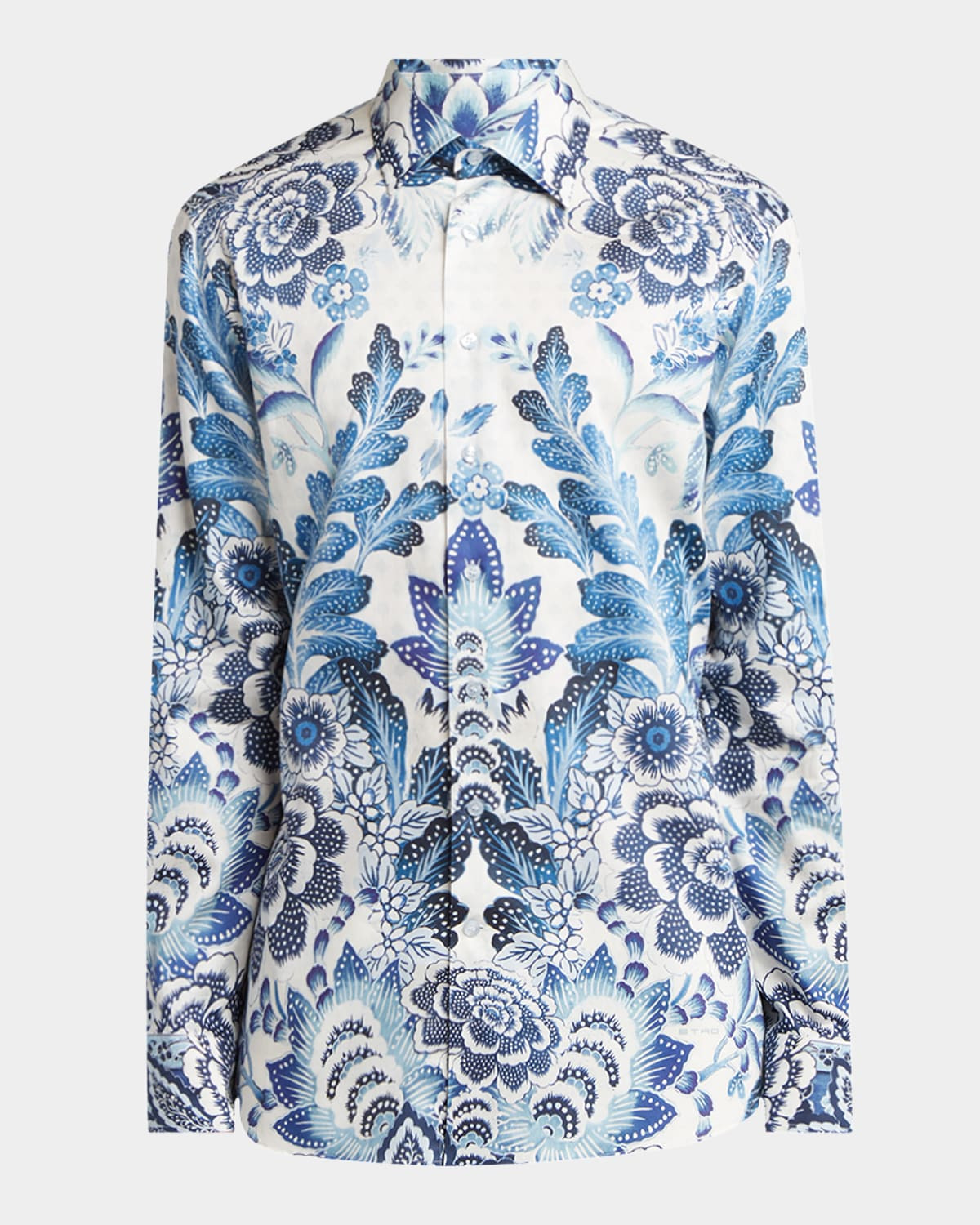 - Etro sport shirt in breathable cotton with a vibrant abstract Palm print for a bold statement - Point collar - Button placket - Long sleeves - Round barrel cuffs - Back yoke - Shirttail hem - Cotton - Professional cleaning recommended - Made in Italy
