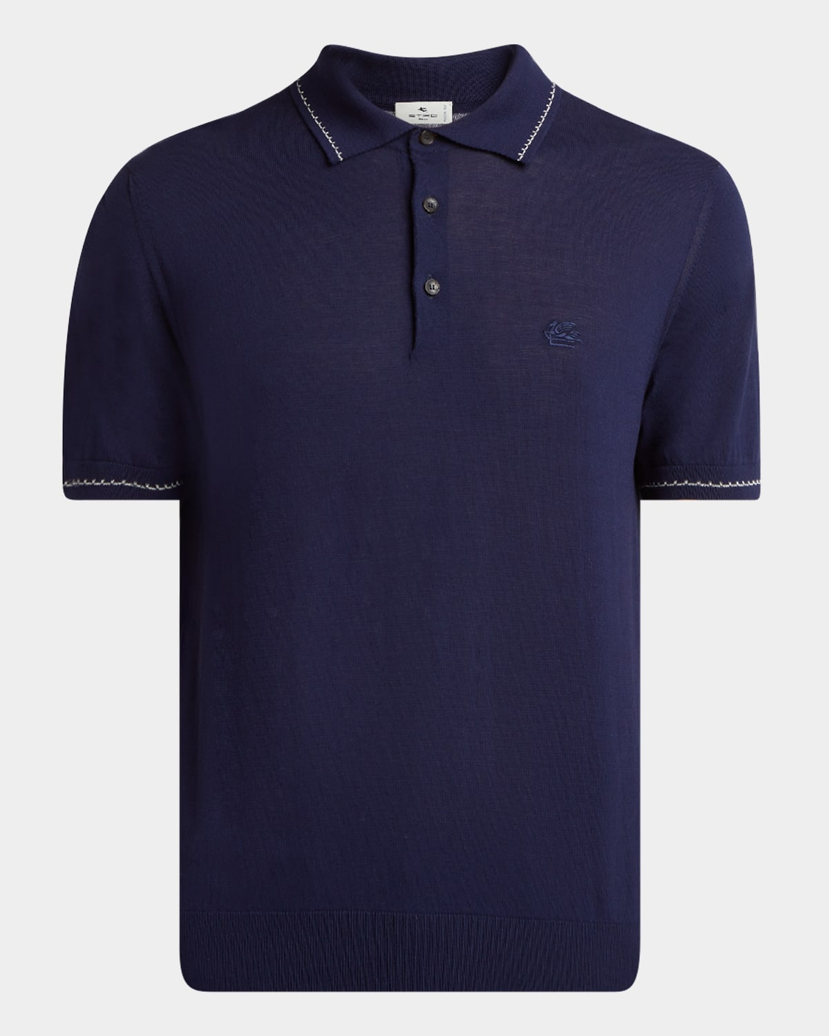 - Etro knit polo shirt in breathable cotton accented with contrast stripe ribbed trim - Shirt collar - Three-button placket - Short sleeves - Ribbed cuffs and hem - Pullover style - Cotton - Professional cleaning recommended - Made in Italy