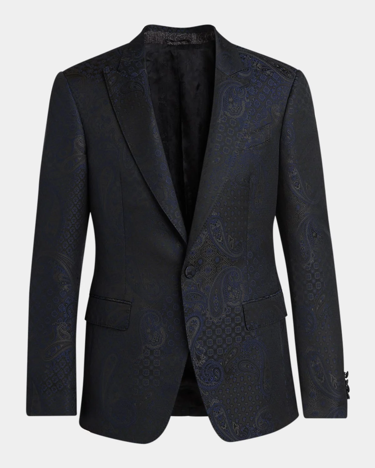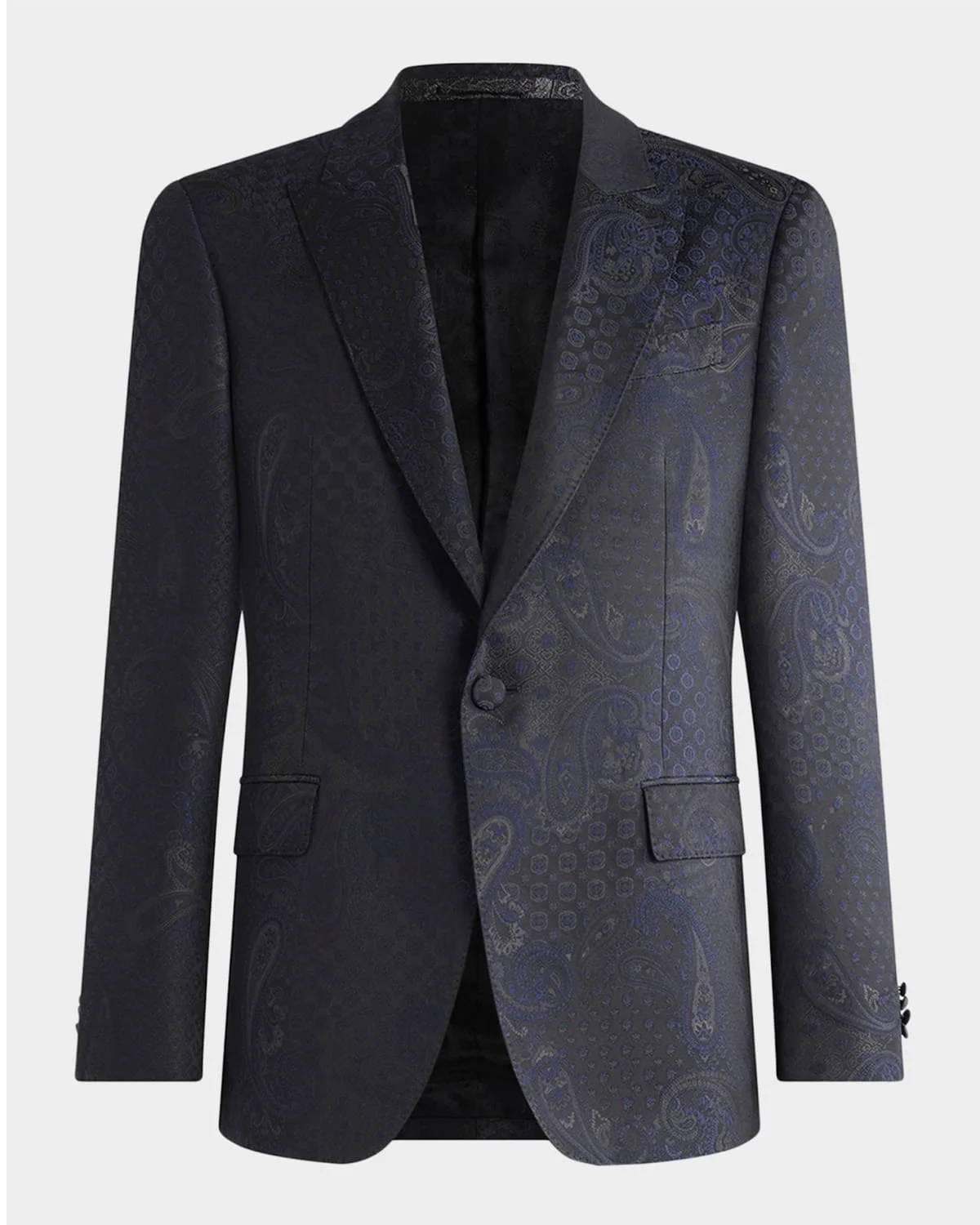This Etro blazer offers a subtle jacquard exterior and a toneontone jacquard interior lining. Peak lapels Singlebreasted singlebutton closure Welt breast pocket Hip flap pockets Buttoned cuffs Fabriccovered buttons Doublevented back Polyester/cotton/nylon/polyamide Lining: Acetate/polyester/viscose Professional cleaning recommended Made in Italy