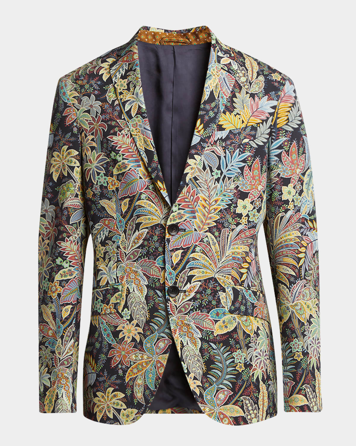 - Etro evening jacket showcasing a multicolor palms print - Notched lapels - Two-button front - Barchetta chest pocket - Hip flap pockets - Internal breast pocket - Long sleeves - Four-button cuffs - Double-vented back - Wool/nylon/elastane - Lining: Acetate/viscose - Professional cleaning recommended - Made in Italy