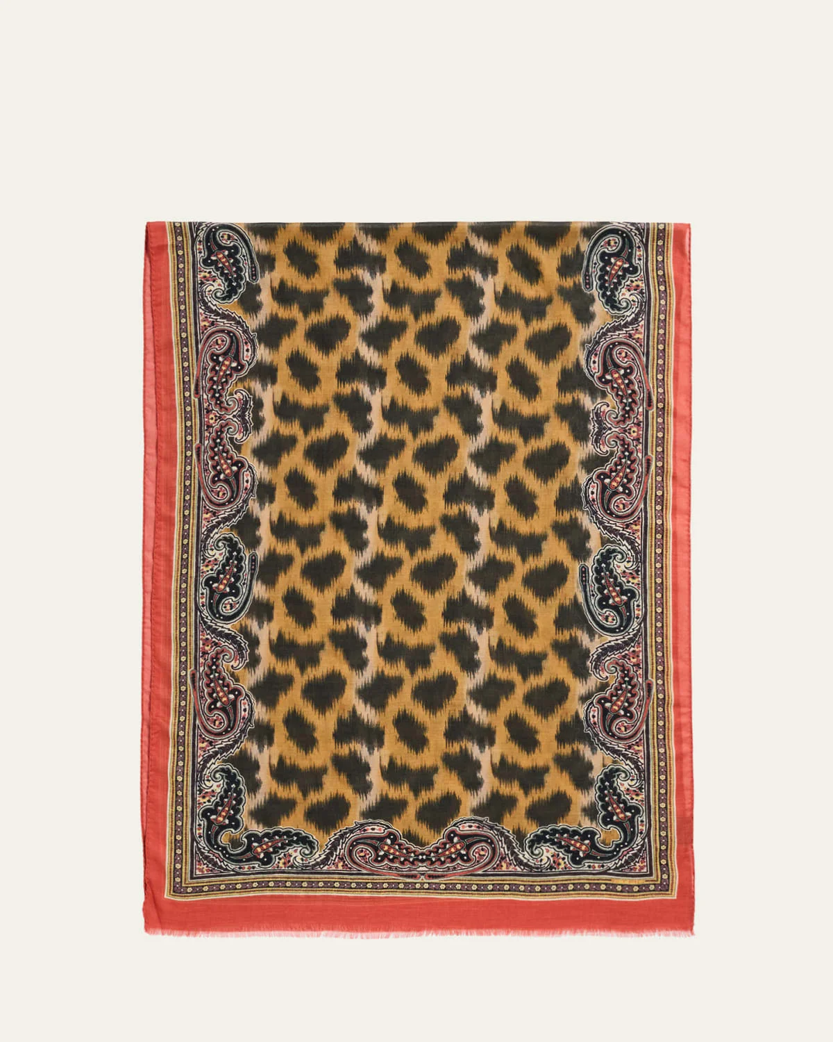 Crafted of modal and cashmere, Etro & apos;s "Orfeo" scarf features an animal print and raw-edge ends. Approx. 27.5"W x 80"L Modal/cashmere Dry clean Made in Italy