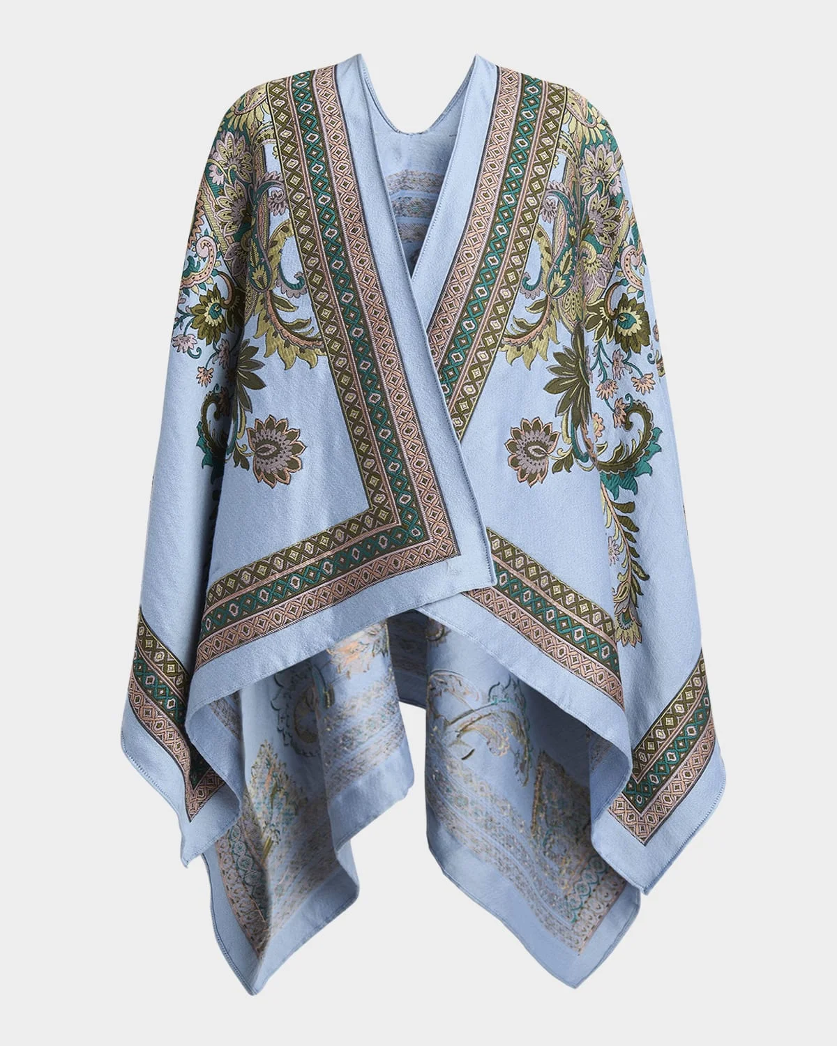 - Etro poncho showcases a paisley jacquard motif with a geometric border - Open front - Long cape sleeves - Asymmetric hem - Falls below the hips - One size fits most - Polyester/wool - Dry clean - Made in Italy - Proposition 65 warning for California residents