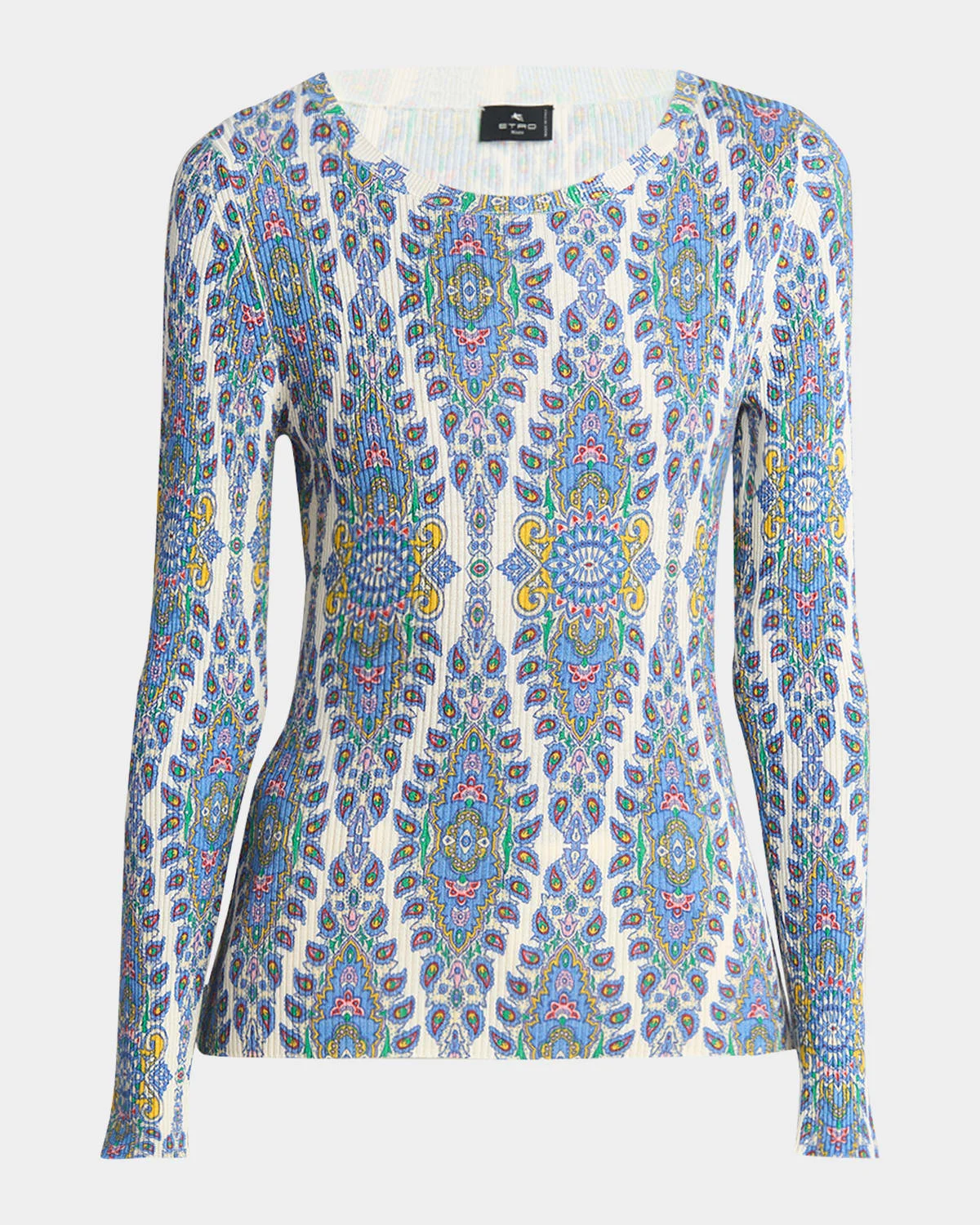 Etro knit top decorated with a paisley motif Crew neckline Long sleeves Hip length Fitted Pullover style Silk/viscose Professional cleaning recommended Made in Italy