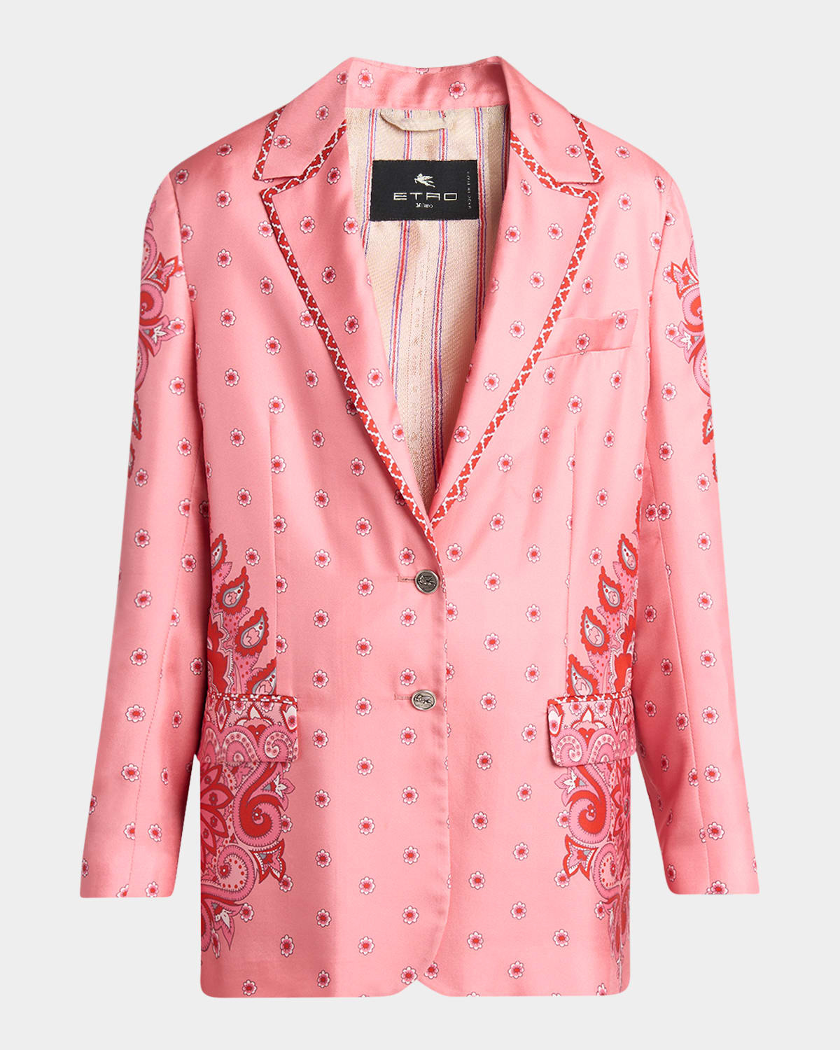 - Etro silk twill jacket featuring a pink medallion motif - Notch lapels; single-breasted front - Long sleeves; button cuffs - Chest welt pocket; side flap pockets - Straight fit - Silk - Made in Italy