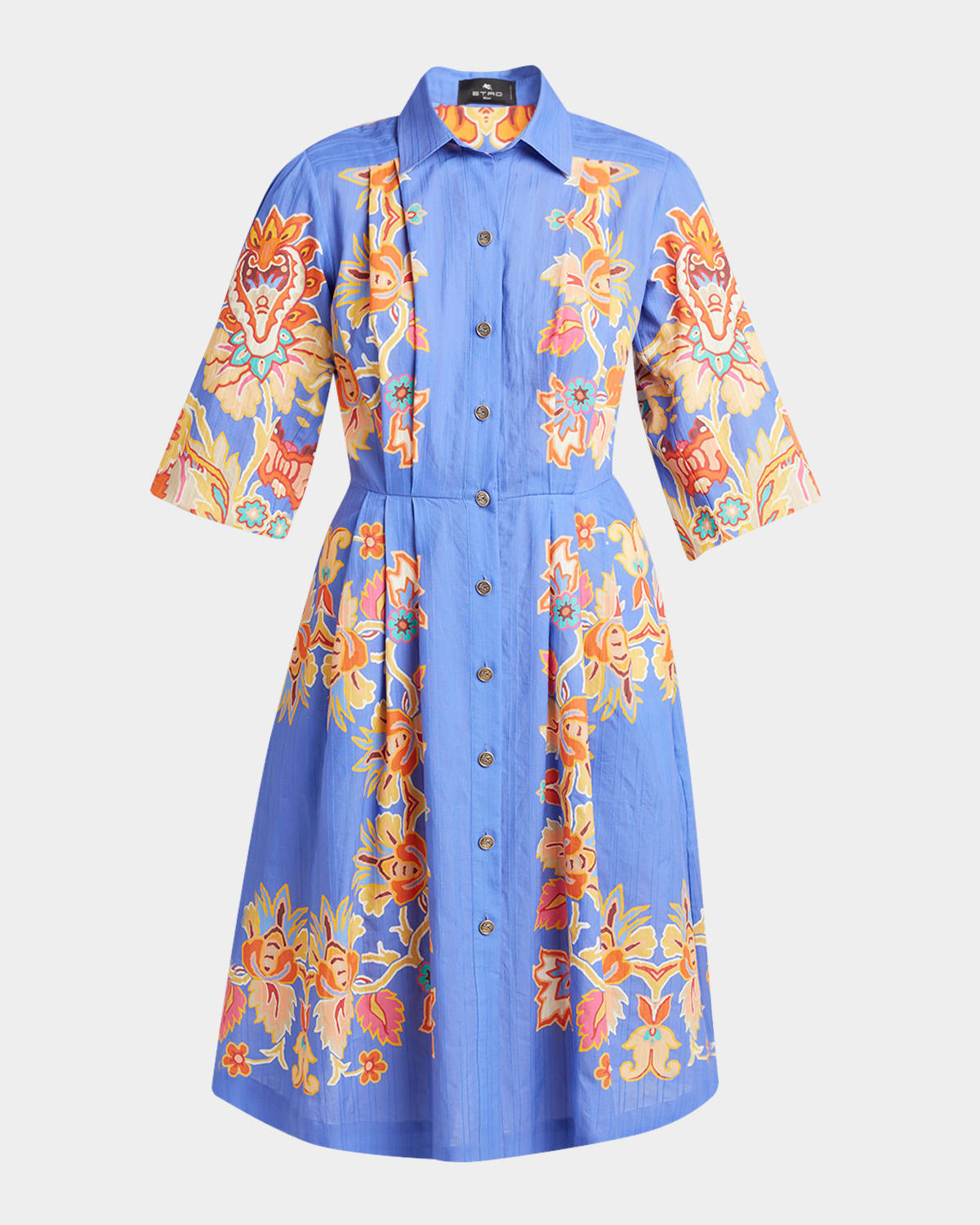 - Etro shirtdress featuring a blue bouquet print and pleating detail along the waist and shoulders - Point collar; button front - Short puff sleeves - Side split pockets - Fit-and-flare silhouette - Knee length - Cotton - Made in Italy