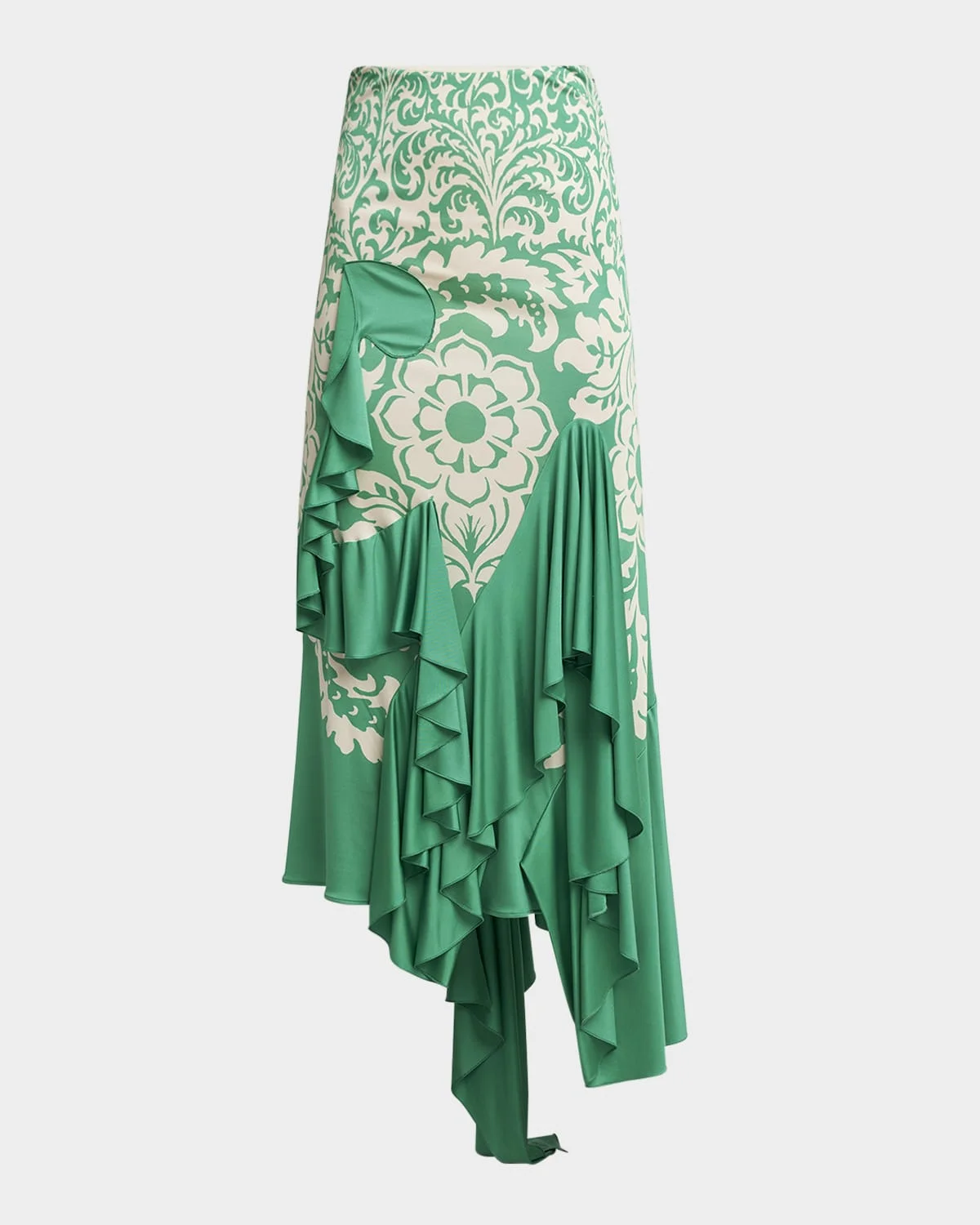 - Etro skirt featuring a demask print and asymmetric draped ruffles - High waist - Skirt falls straight from hip to hem - Full length - High-low hem - Invisible side zip - Viscose/elastane - Made in Italy