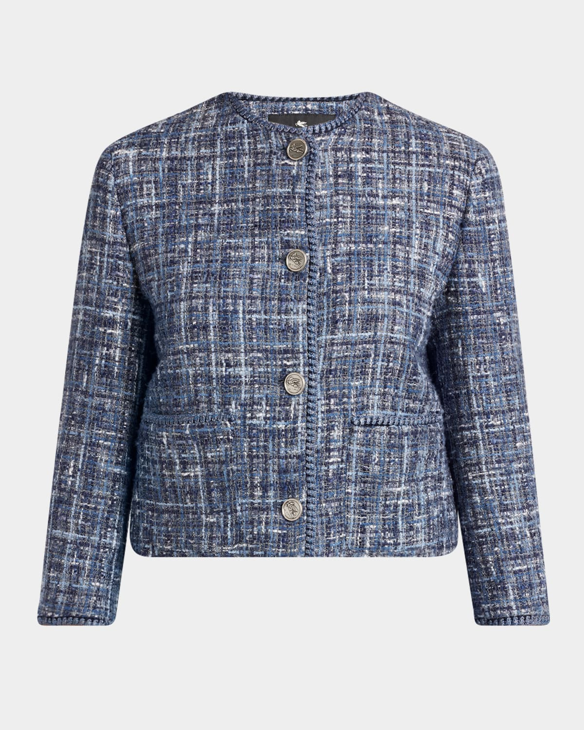 - Etro tweed jacket with blanket-stitched edges - Round neckline; single-breasted front - Long sleeves - Hip welt pockets - Straight fit - Cropped length - Cotton/linen/viscose - Made in Italy