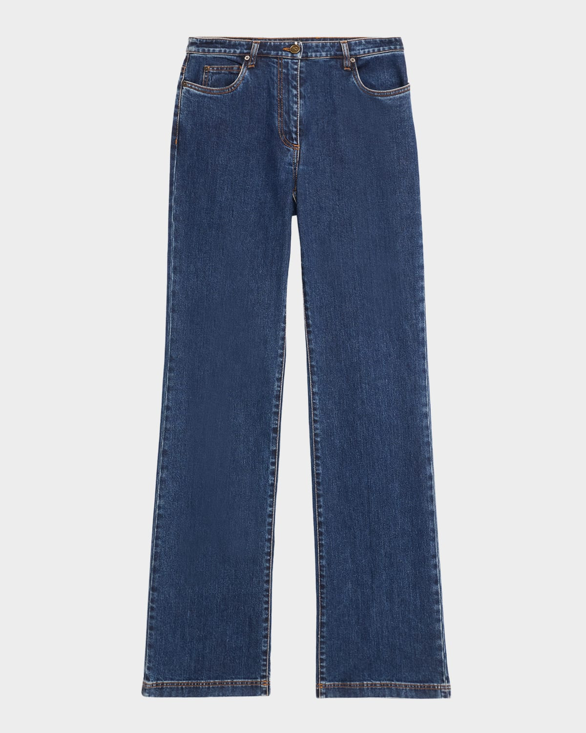 - Etro jeans in dark-wash denim with faded details and signature logo embroidered on the back pocket - High-rise sits high on the hips - Flat front - Five-pocket style - Full length - Straight legs - Button/zip fly; belt loops - Cotton - Made in Italy