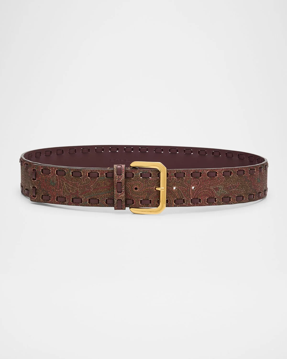 - Etro Arnica printed calfskin leather belt with threading detail - Goldtone hardware - Adjustable fit - Leather/cotton/polyester - Professional cleaning recommended - Made in Italy