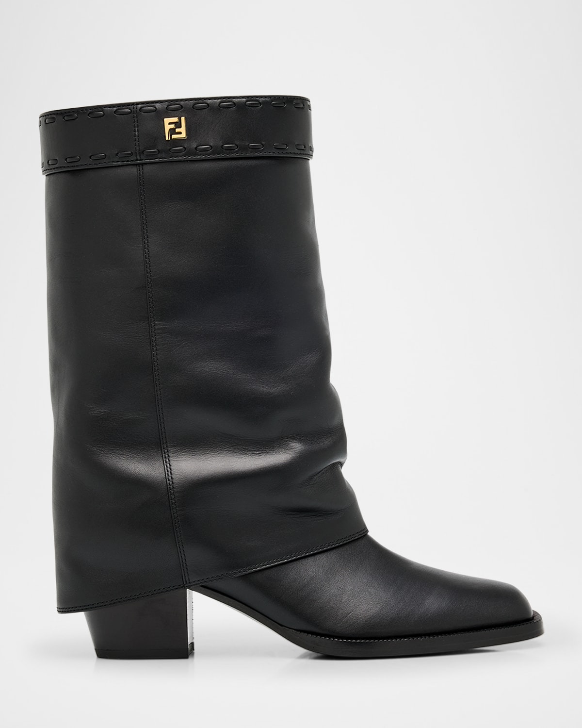 Handmade from calf leather with handsewn tonal Sellerie topstitching along the collar, these booties by Fendi feature an extended shaft that partially covers the heel, creating a trompe l'oeil pant effect 2.25 in / 55 mm block heel Square toe Golden FF logo at the collar Pullon style Leather outsole Lining: Elastane/polyacrylic Made in Italy