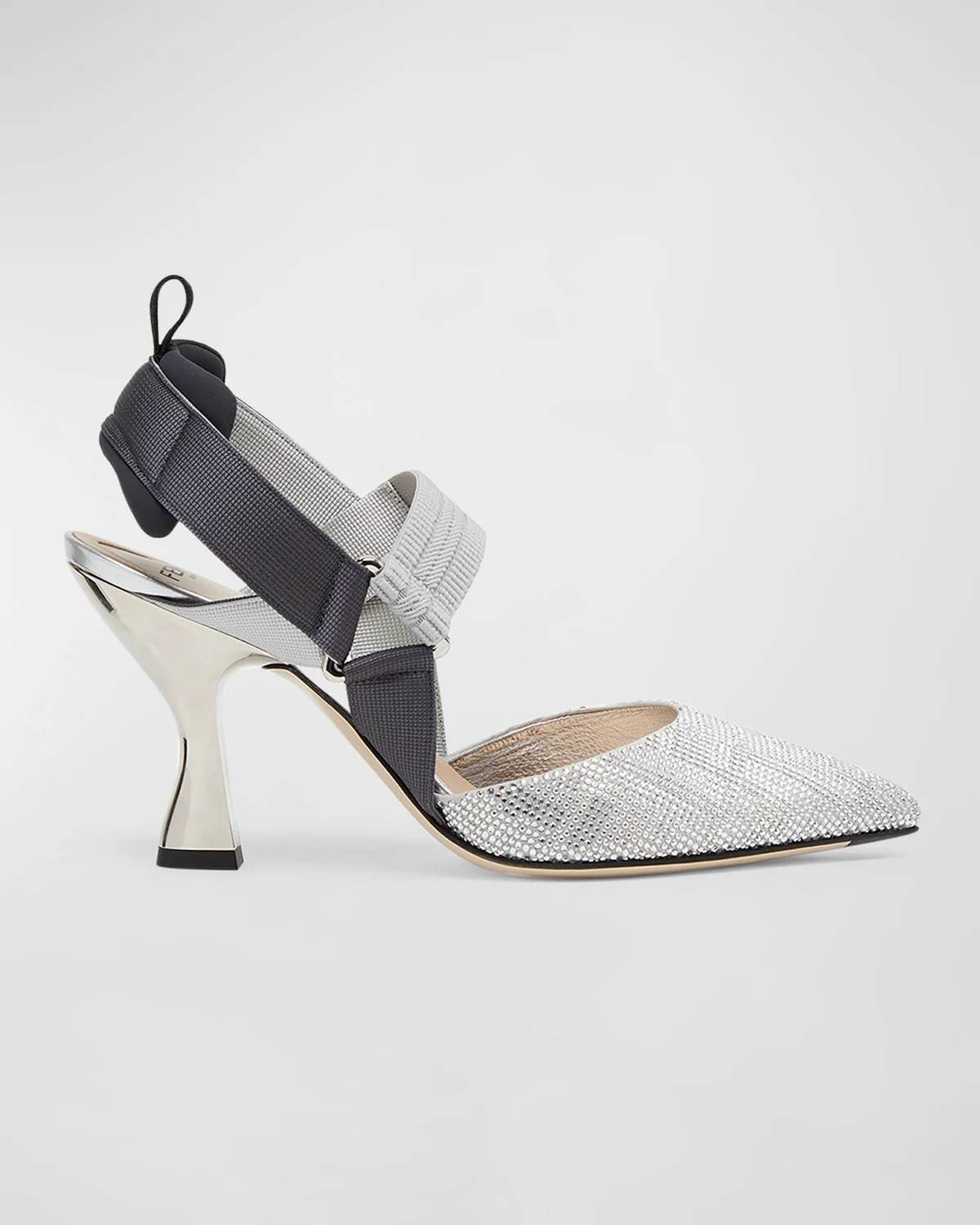 Fendi modern pumps in "FF" crystal-embellished fabric. An unexpected balance of chic and sporty, this pointy-toe slingback pump features grosgrain-ribbon trim. 3.25 in / 85 mm architectural heel. Pointed toe. Stretchy grosgrain strap over instep. Padded slingback strap with pull-loop detail. Leather lining and outsole. "Colibri" is made in Italy.