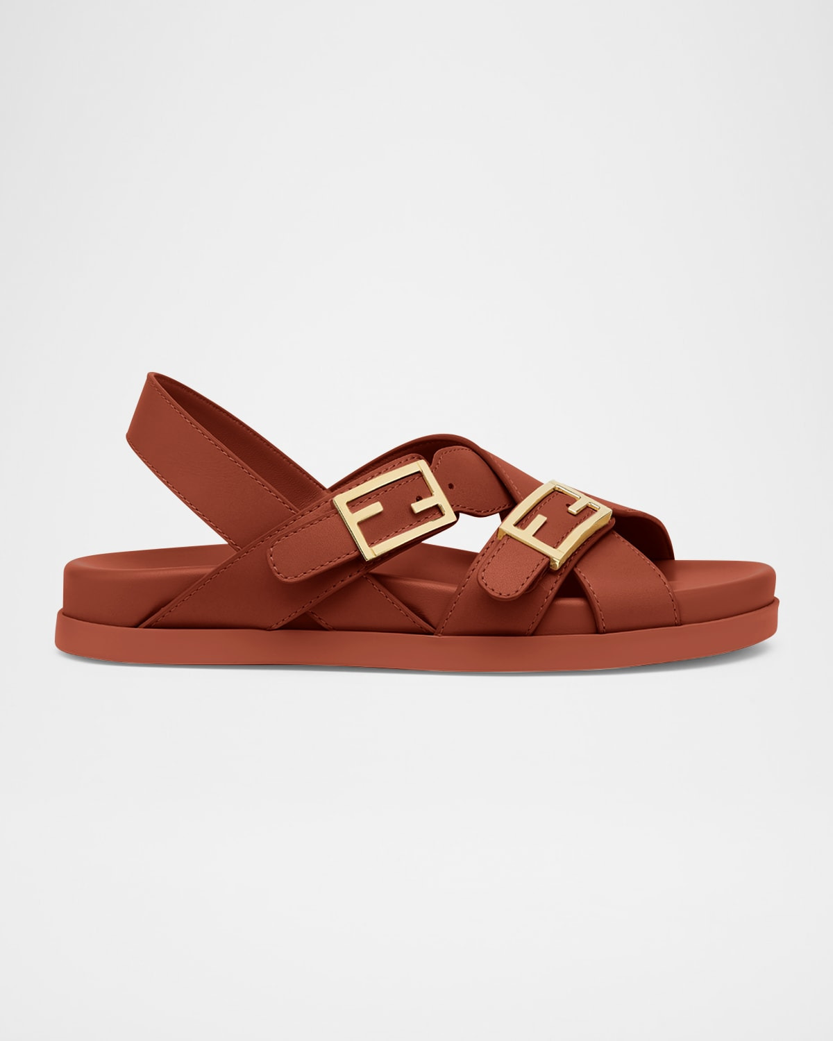 - Fendi "Feel" sandals in calf leather featuring gold-tone FF-shaped buckles - Flat heel - Open toe - Crisscross double-buckle straps - Slingback strap - Rubber outsole - Professional cleaning recommended, spot clean - Made in Italy