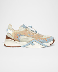 - Fendi "Flow" colorblock suede and mesh fabric trainer sneakers. - Logo detail at side. - 1.3" flat heel. - Round toe. - Drawstring vamp. - Cushioned footbed. - Rubber sole. - Made in Italy.