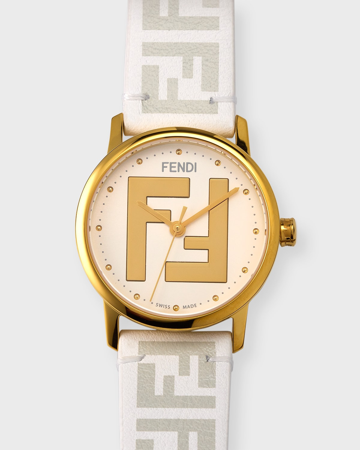 - Forever Fendi watch - Approx. 29mm round case - Stainless steel with a gold-tone finish - White dial with FF motif at the center - Signature logo text at 12 o'clock - Domed dots as the time markers - Calf leather strap with FF logos - Adjustable length; thorn buckle - Two-hand movement - Made in Switzerland