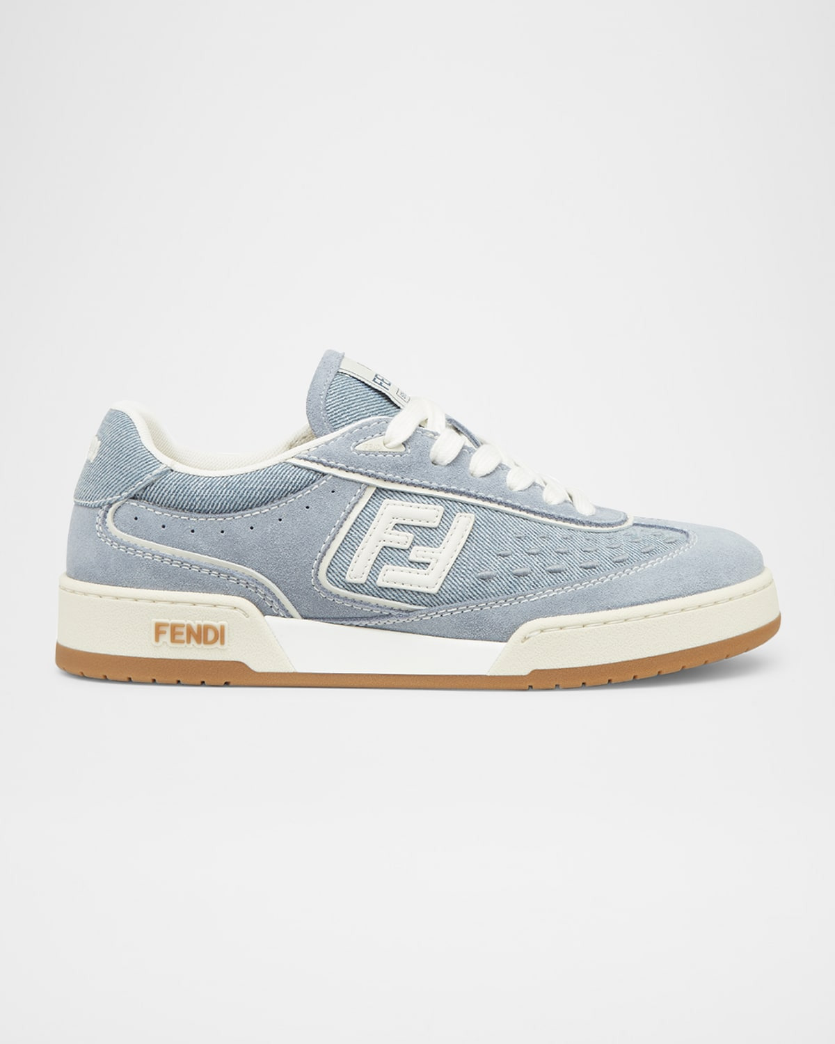 - Fendi "Match" low-top sneakers in denim with suede trim - Features FF leather appliques on the sides - 2.00 in / 50 mm flat heel - Round T-toe - Lace-up vamp - Vintage label on tongue - Padded collar - Backstay logo - Covered rubber cupsole - Branded rubber outsole - Professional cleaning recommended, spot clean - Made in Italy