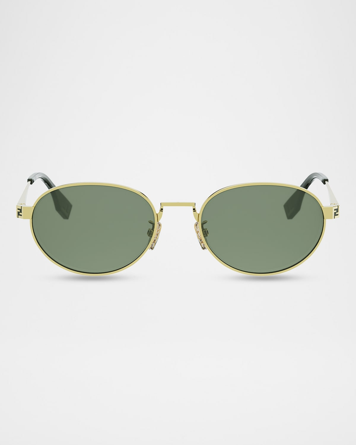 The "Fendi Sky" oval sunglasses by Fendi boast goldtone metal frames with an FF plaque between the lenses and temples Lens/bridge/temple (in mm): 5519145 Solidcolor lenses Adjustable nose pads Dark green acetate temple tips with FF motif Metal Wipe clean 100% UVA/UVB protection Made in Italy