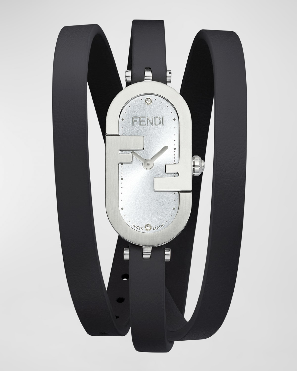 Fendi watch featuring a stainless steel oval case White dial with two diamonds Bezel with signature FF motif Calf leather wraparound strap Total carat weight: 0.01 Twohand movement Adjustable length Thorn buckle Made in Italy