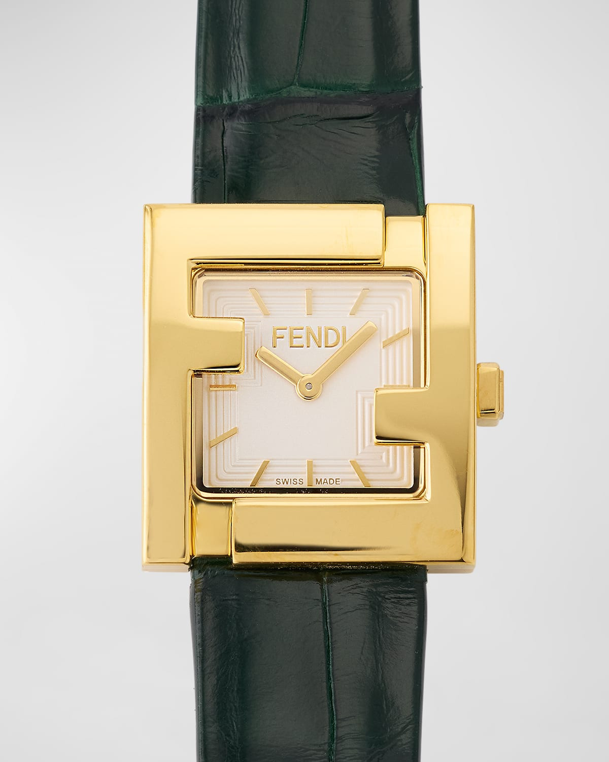 - Fendi watch in gold-tone stainless steel - Square case with signature FF bezel - Black dial with baton time markers - Logo text at the 12 o'clock index - Black alligator strap with thorn buckle - Water resistant to 5 ATM (164 feet/50 meters) - Swiss-made quartz movement - Adjustable length - Made in Switzerland