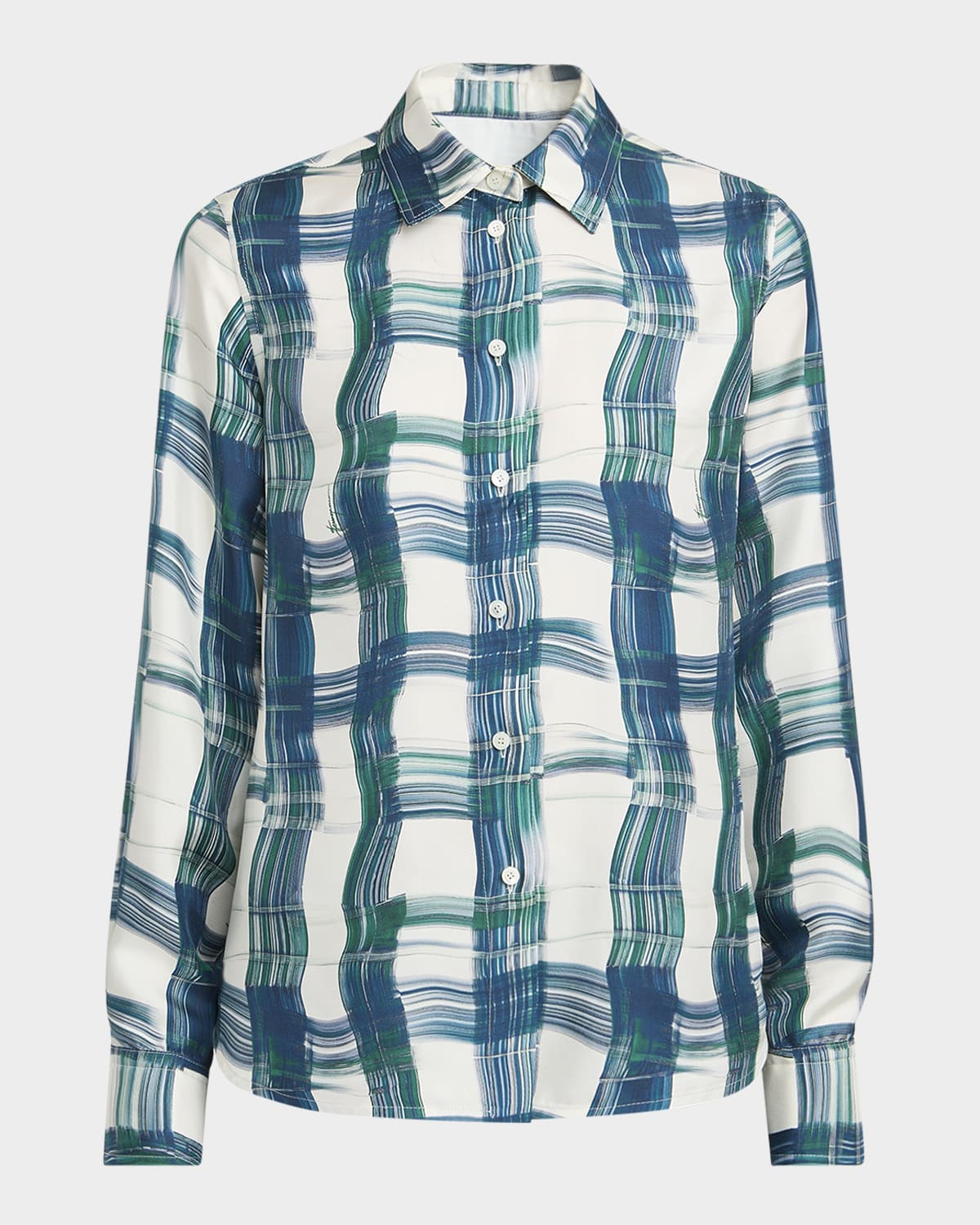 - Ferragamo blouse crafted from silk twill in brushstroke check - Spread collar; button front - Long sleeves; button cuffs - Back yoke; box pleat - Relaxed fit - Silk - Dry clean - Made in Italy