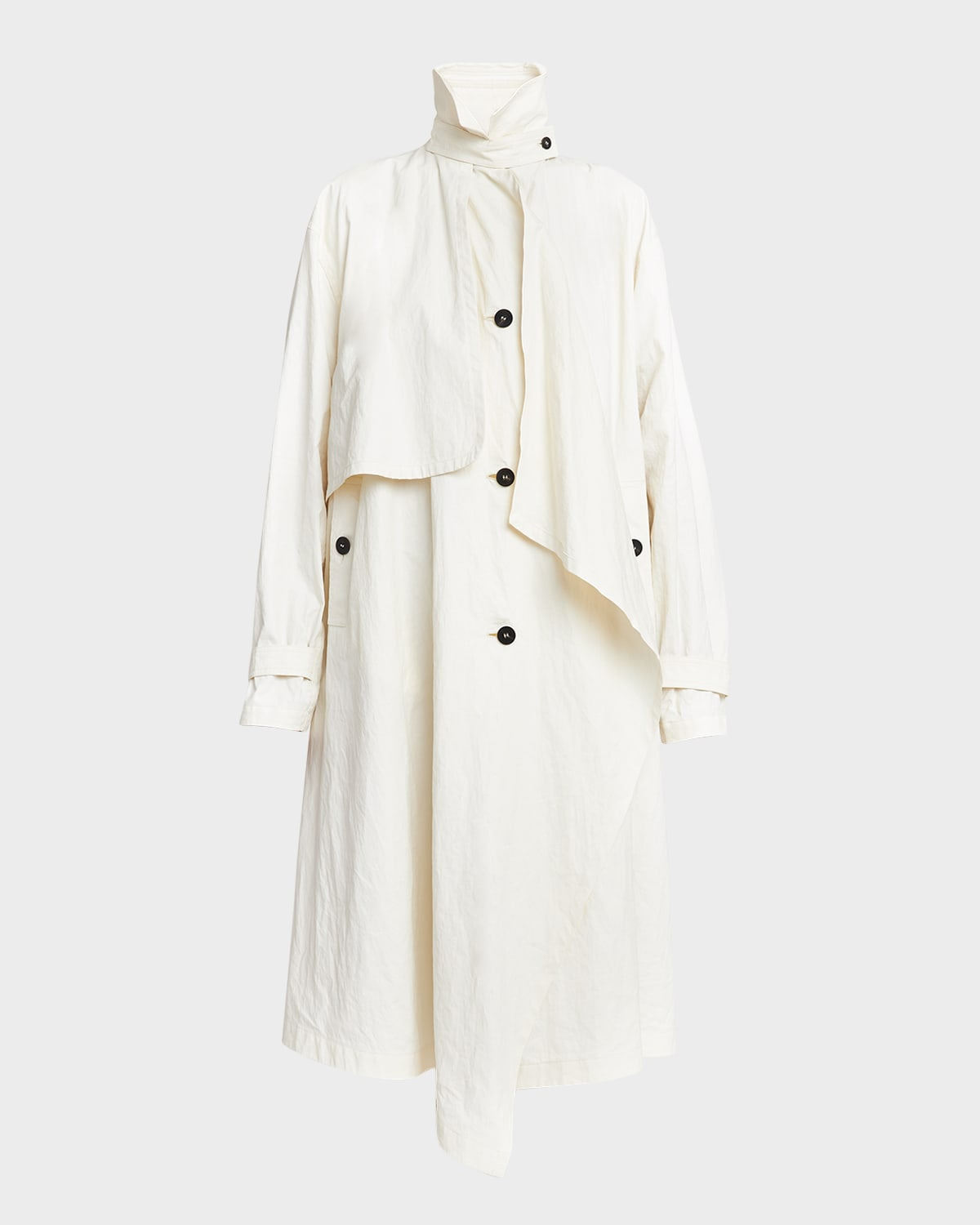 Ferragamo trench coat in coated linen Point collar with throat latch; doublebreasted front Long sleeves; belted cuffs Chest gun flaps; rain shield back Side buttonwelt pockets Oversized fit Hem falls below the knee Centerback slit hem Linen Lining: Rayon Professional cleaning recommended Made in Italy