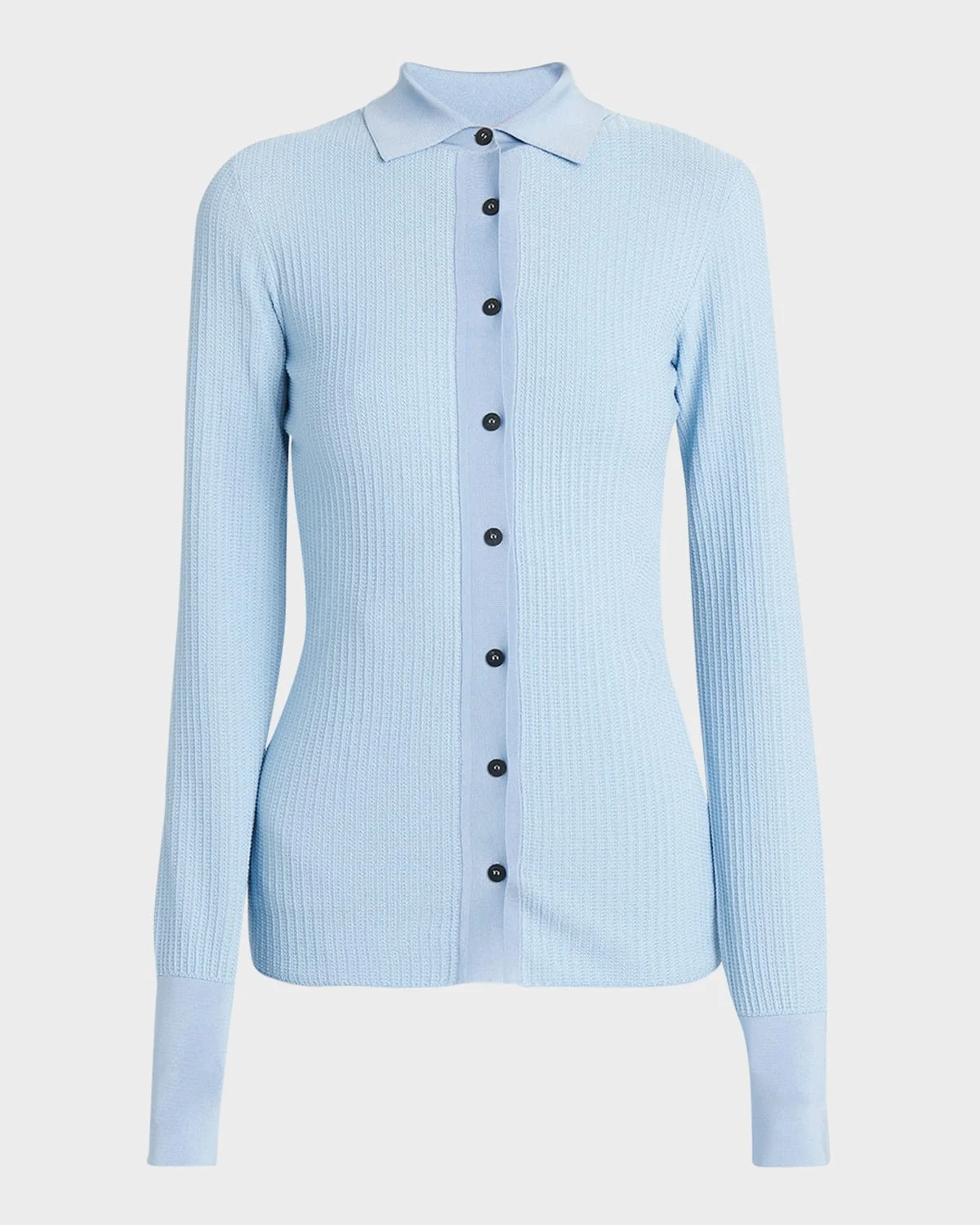 Ferragamo micro jacquard cardigan Spread collar; button front Long sleeves Slim fit Viscose/silk/cotton Unlined Professional cleaning recommended Made in Italy