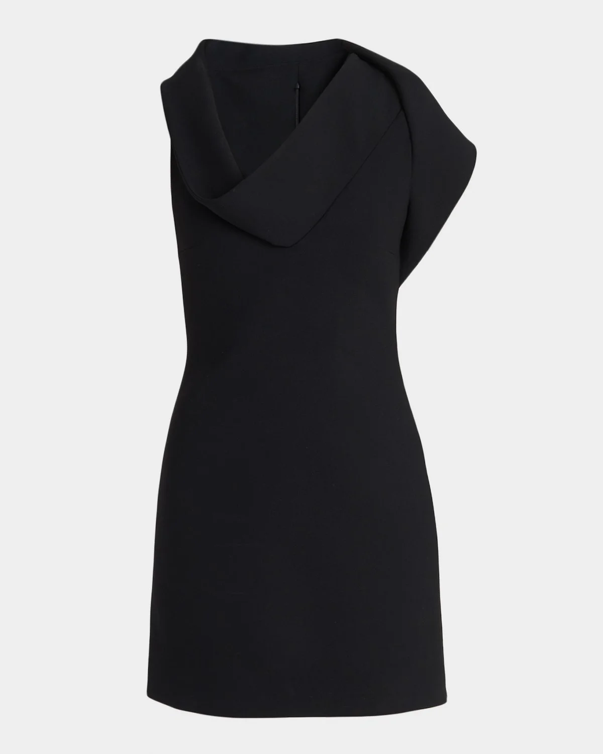Ferragamo dress is crafted of stretch twill featuring & nbsp;asymmetric & nbsp;draping along the neckline Cowl neckline Short sleeve left; sleeveless right Sheath silhouette Mini length Invisible back zip Virgin wool Made in Italy