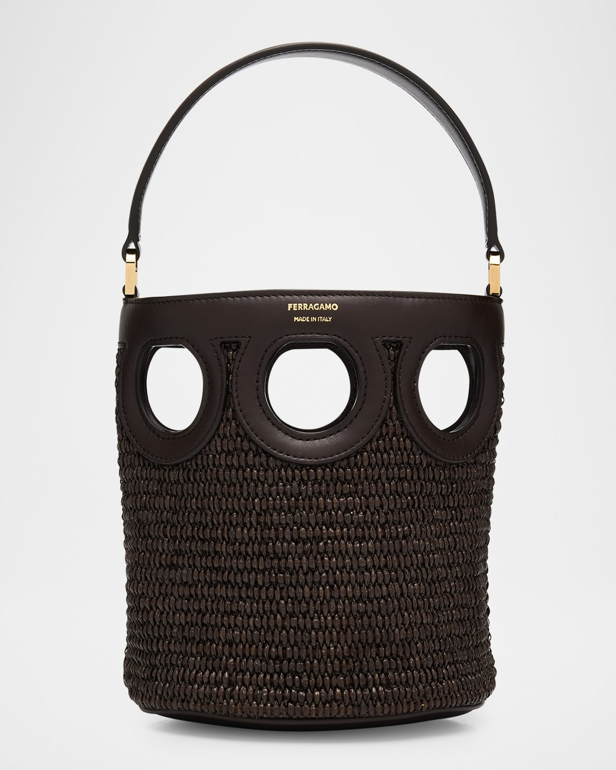 - Ferragamo bucket bag in raffia with smooth leather trim and circular cutouts - Flat shoulder strap - Open top - Cotton twill lining - Approx. 7.1"H x 6.7"W x 4.7"D - Made in Italy