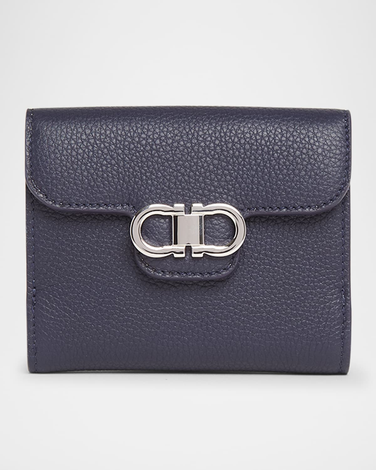 - Ferragamo bicolor wallet in grainy leather - Flap top with snap closure; double Gancio logo accent - Exterior, back pocket - Approx. 3.1"H x 4.3"W - Professional cleaning recommended, spot clean - Made in Italy